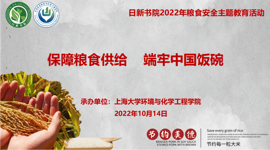 粮食安全是“国之大者”,习近平总书记多次就粮食安全问题发表重要讲话、做出重要指示批示。临近世界粮食日,为进一步加强师生粮食安全意识,日新书院于10月14日下午面向全体新生以线上与线下结合的形式开展2022年粮食安全主题教育活动。本次活动由英国上市365承办,日新书院执行院长、材料学院党委副书记、副院长祁晶老师,生命学院党委副书记、副院长朱晓青老师线上出席,环化学院党委副书记、副院长潘赟老师线下出席活动。