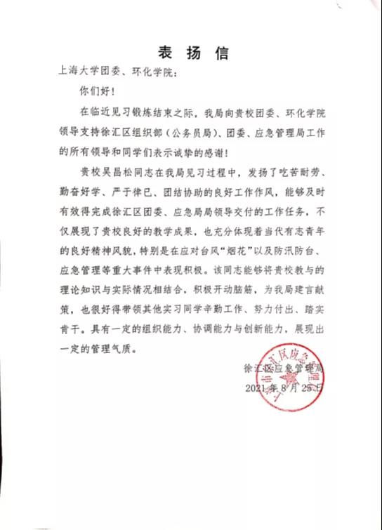 习近平总书记强调“广大青年要把自己的理想同祖国的前途、把自己的人生同民族的命运紧密联系在一起,扎根人民,奉献国家。刀要在石上磨,人要在事上练,不经风雨,不见世面是难以成大器的”。吴昌松在上海市应急局挂职锻炼过程中,吃苦耐劳、勤奋好学、严于律已,有效完成徐汇区团委、应急局交付的工作任务,充分体现着当代有志青年的良好精神风貌,特别是在应对台风“烟花”以及防汛防台、应急管理等重大事件中表现积极、努力付出、踏实肯干,展现了当代大学生自强奉献精神!
