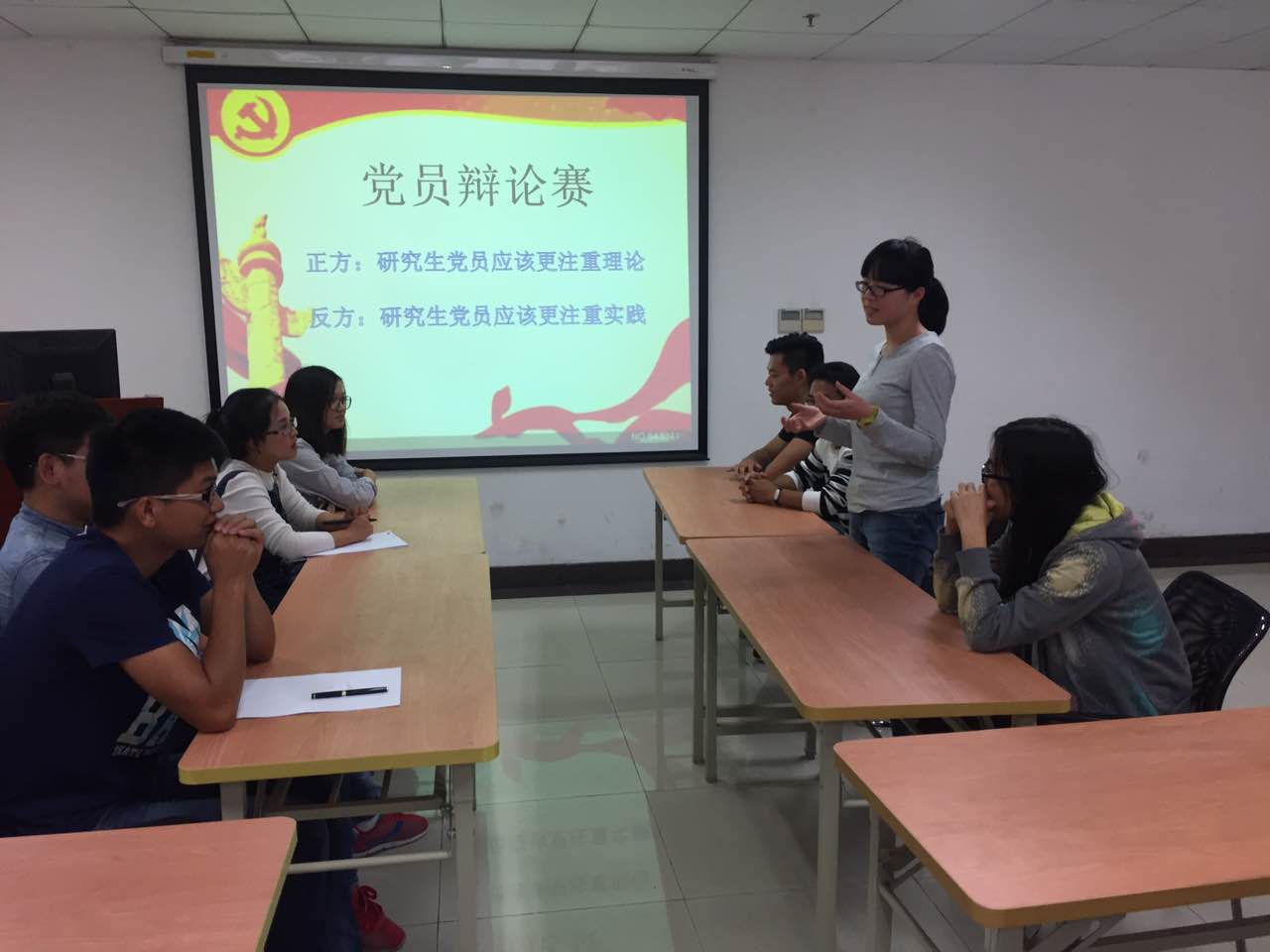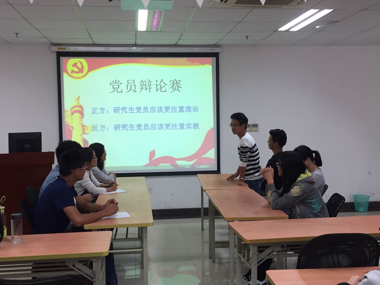 本次辩论赛由党支部8名学生党员参加,通过自我陈述,自由辩论,总结陈词三个环节展开。以王海涛,陈艳,高玉婷,张志明为代表的正方以"从小在校学习理论知识","终身学习"以及"有理论基础的大学生能够更好地参与工作"为观点阐述了研究生党员应该更注重理论知识的学习;以曹奕,程二波,高冬冬,王咪咪为代表的反方以"实践是检验理论的唯一标准","中国共产党在不断实践摸索中走向复兴"等为观点支持研究生党员应该更注重实践。自由辩论阶段更为激烈,双方各抒己见,引经据典,辩论赛在双方四辩精彩的总结发言中结束。双方辩论结束后,台下观战的党员们也纷纷提问,营造了良好的学习氛围。
