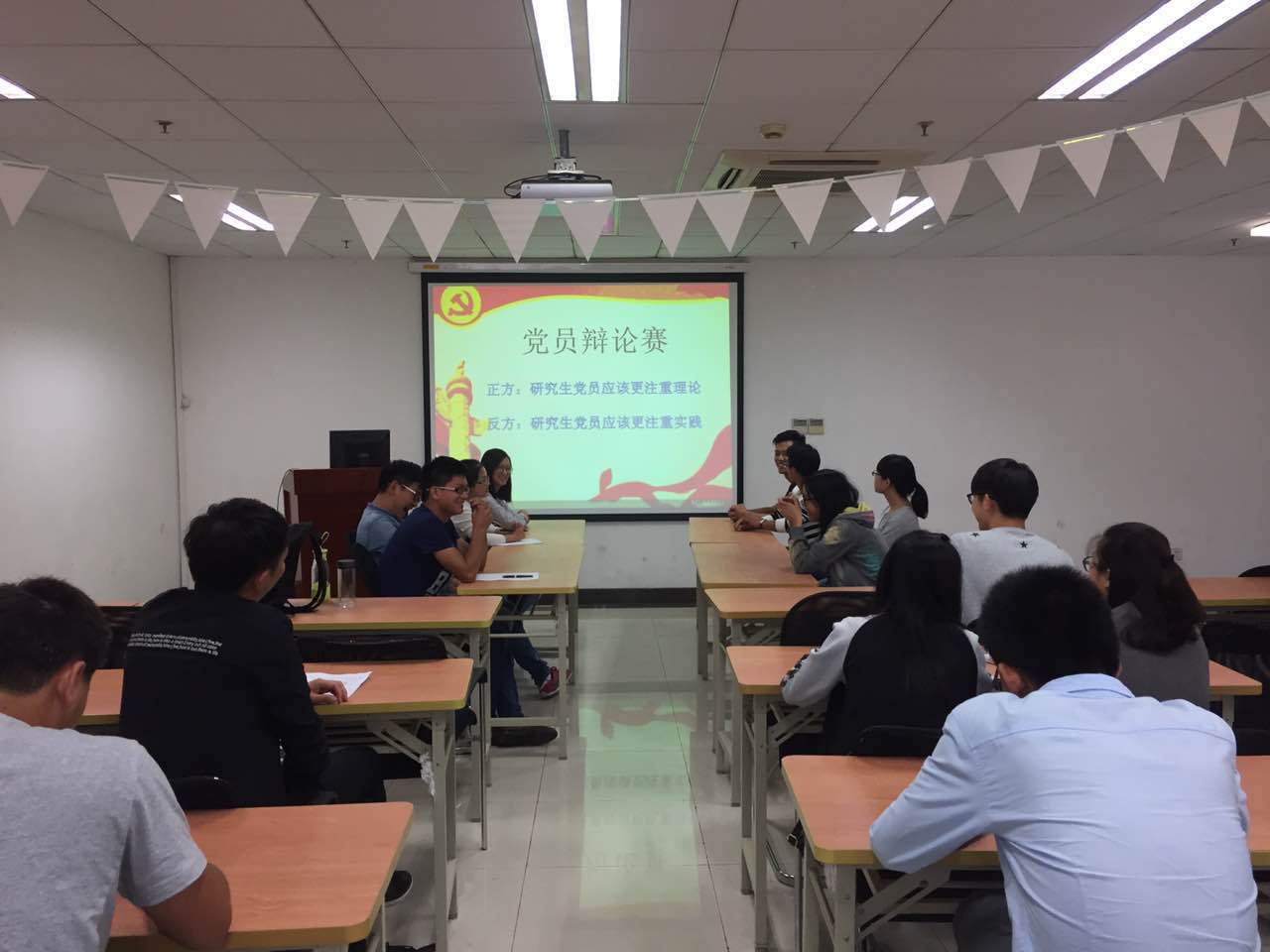 2016年10月11日,为更好地学习习近平总书记"七一"讲话,环化学院16级第二党支部在环化楼301举行了一次党员辩论赛。党员同志们围绕"研究生党员应该更注重实践/研究生应该更加注重理论"为内容,展开激烈辩论。