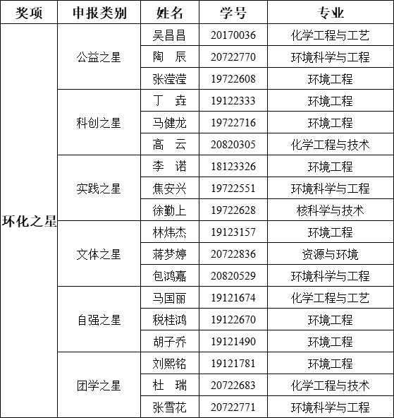 为了贯彻落实党和国家的教育方针,促进学生全面发展,鼓励学生践行“自强不息”校训,彰显英国上市365学生风采,特设立英国上市365“环化之星”评奖项目。经本人申请,学院评审小组评审,现公示2020-2021学年英国上市365推荐“环化之星”候选人名单。