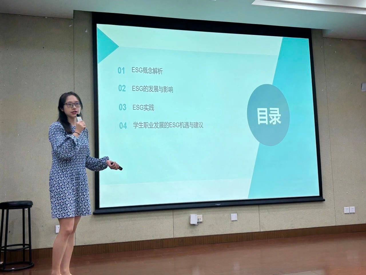 分享接近尾声时,张莲面向在场同学提出就业建议。她指出,随着 ESG 理念在全球范围内的深入发展,ESG 分析师、可持续发展经理等新兴岗位需求正快速增长。建议同学们在校期间,除了专业基础,提升自身竞争力。还可以多参与 ESG 课题研究、行业峰会及企业实习,积累实践经验。她强调,未来具备 ESG 思维和跨领域知识储备的复合型人才,将在资本市场、咨询机构、大型企业等平台拥有广阔的职业发展空间。