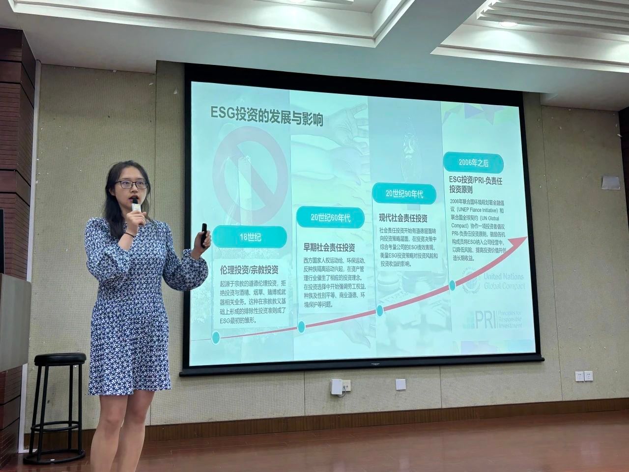 在分享过程中,张莲化身循循善诱的 “ESG 引路人”,运用 PPT 动态图表等多元化展示手段,将 ESG 理念与实际生活紧密相连。讲到某知名车企尾气排放造假事件时,她调出一组触目惊心的数据:该企业最终被处以超 300 亿欧元罚款,全球销量暴跌 15%,并通过对比造假前后的企业股价走势,直观呈现出环境责任缺失带来的连锁反应。这不仅让企业面临巨额罚款与声誉受损,更深刻暴露出企业忽视环境责任的严重后果,让同学们直观感受到 ESG 体系中环境维度的重要性。