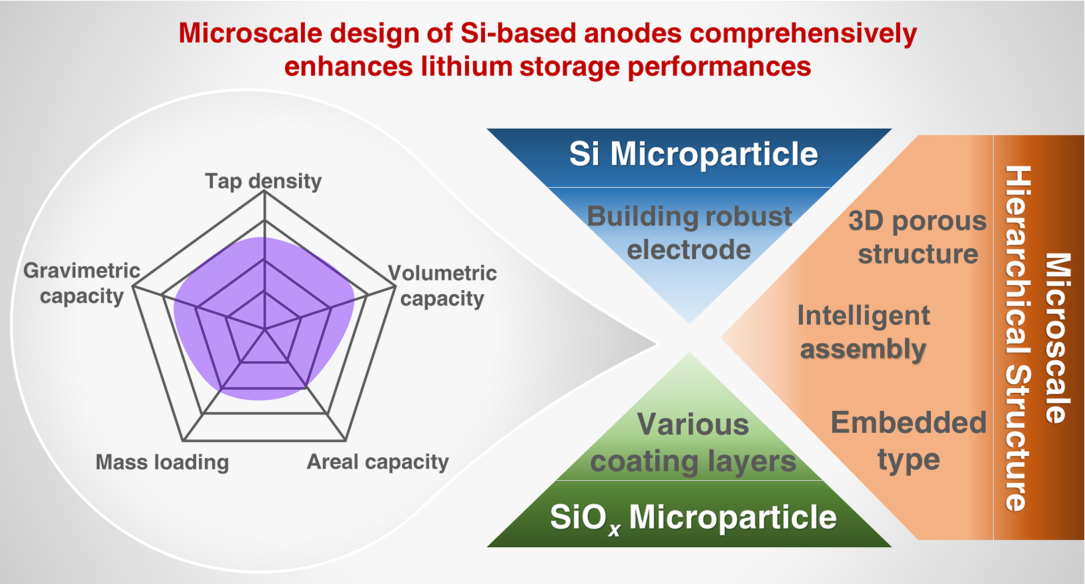 硅基负极材料因其高的比容量等突出优点而被视为最有潜力的下一代储锂商用材料。然而,其大规模应用仍面临一些关键性的挑战。针对实用硅负极难以大规模商业化应用的问题,本综述从多项实用性能指标综合评述了微米硅基负极材料实用化设计的最新进展(图2),包括从纳米尺度转为微米尺度设计的重要意义,三类重要的微米尺度硅基负极材料(硅微米颗粒、氧化亚硅微米颗粒、微米分级结构硅基负极)的设计策略、锂化行为和结构-性能关系等。同时,对组成电池器件的其他重要因素如粘结剂、电解质、预锂化技术等的最新进展也进行了概括性总结。最后对高能量密度硅基锂离子全电池的实用性、机遇和挑战也进行了概述和展望。