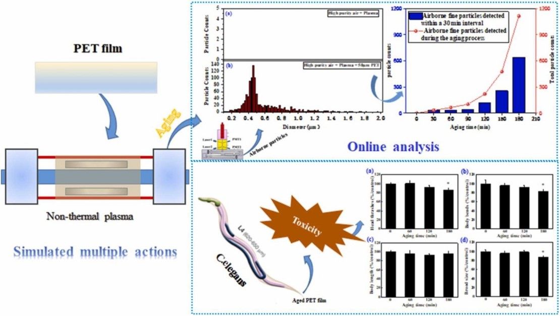 成果一:在线研究低温等离子体加速老化聚对苯二甲酸乙二醇酯(PET薄膜)的过程及毒性(Online study of the plasma-accelerated aging process and toxicity of polyethylene terephthalate,发表于《Journal of Hazardous Materials》)