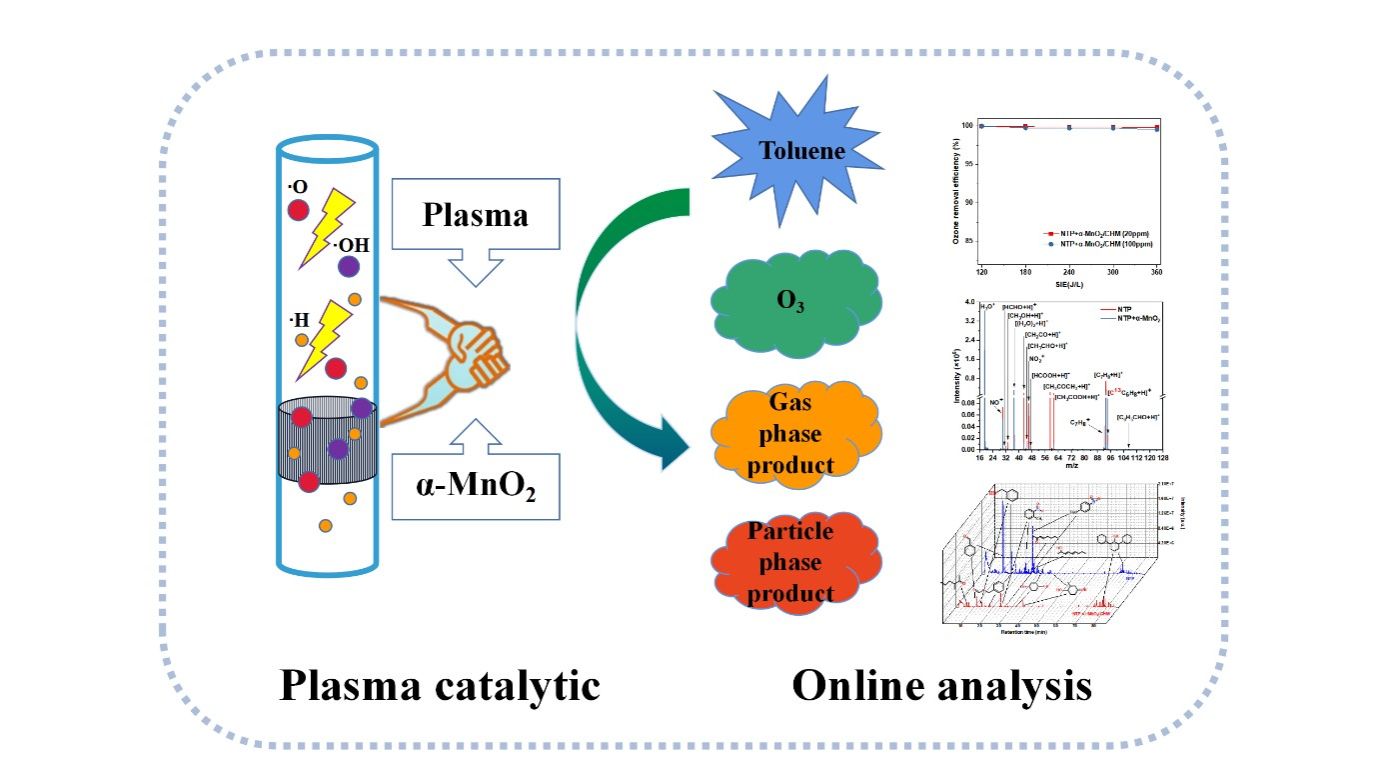 非热等离子体(NTP)技术用以降解挥发性有机物(VOCs)会产生如O3和纳米颗粒等副产物,在实际应用中仍面临挑战。本研究采用蜂窝状α-MnO2/堇青石整体式(CHM)催化剂来减少NTP降解甲苯的副产物。结果表明,使用α-MnO2/CHM催化剂不仅能将降解效率提高到98%,COx选择性提高到50%,同时还能大幅减少有机组分、臭氧和颗粒物三种有害副产物的释放。研究采用在线检测技术,探讨了甲苯及其副产物降解的机理,包括:高能电子和活性自由基在放电区的直接降解,以及活性氧在催化剂表面的深度氧化。该项成果对于深入理解等离子体技术和整体式催化剂协同降解VOCs的过程和机理具有重要意义,对推进等离子体-催化剂协同降解技术的实际应用提供重要支撑。
