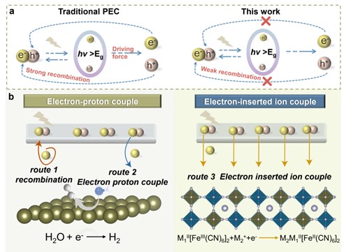 不同体系背后光生载流子分离路径的形成机理及电子转移存储路径示意图:(a)传统的光电化学系统和(b)无偏压驱动离子辅助光电化学(IAPEC)系统