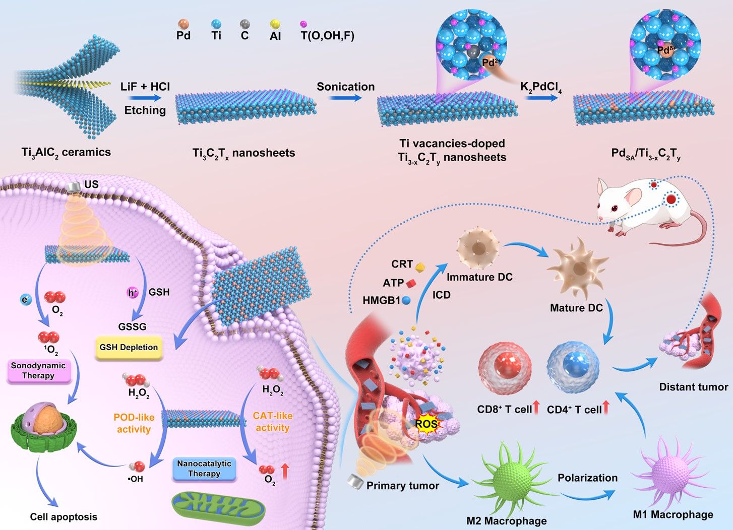 该团队创新性提出理性构筑单原子催化剂重塑肿瘤微环境的新策略,利用Ti3-xC2Ty纳米片中还原性Ti空位来稳定单原子Pd,获得的单原子催化剂中Pd的负载量高达2.5 wt%。与负载Pd纳米颗粒的Ti3-xC2Ty纳米片相比,单原子催化剂具有增强的声动力性能和纳米酶活性,这一现象归因于四个方面的协同作用。首先,单原子Pd的负载有效防止激发的电子空穴对再复合,显著提升声动力活性;其次,超声辐照下产生的空穴可以快速消耗肿瘤微环境中过表达的谷胱甘肽,进一步提升活性氧的产率;第三,单原子增强的类过氧化物酶活性可以催化产生•OH以实现对ROS产率的级联放大;最后,单原子增强的类过氧化氢酶活性可以缓解乏氧的肿瘤微环境,提供更多的O2供SDT产生ROS。更重要的是,SDT/CDT增强的免疫反应可以通过引发免疫原性死亡促进树突细胞成熟,同时可以将促肿瘤M2表型的肿瘤相关巨噬细胞极化为抗肿瘤的M1表型,最终实现对T细胞的激活。体内双侧肿瘤模型证明了单原子催化剂可以通过声动力免疫治疗将原发肿瘤完全消除,并可以通过强大的免疫反应减缓远端肿瘤的生长。该工作展现了单原子催化剂通过重塑肿瘤微环境实现强大的声动力免疫治疗的潜力。