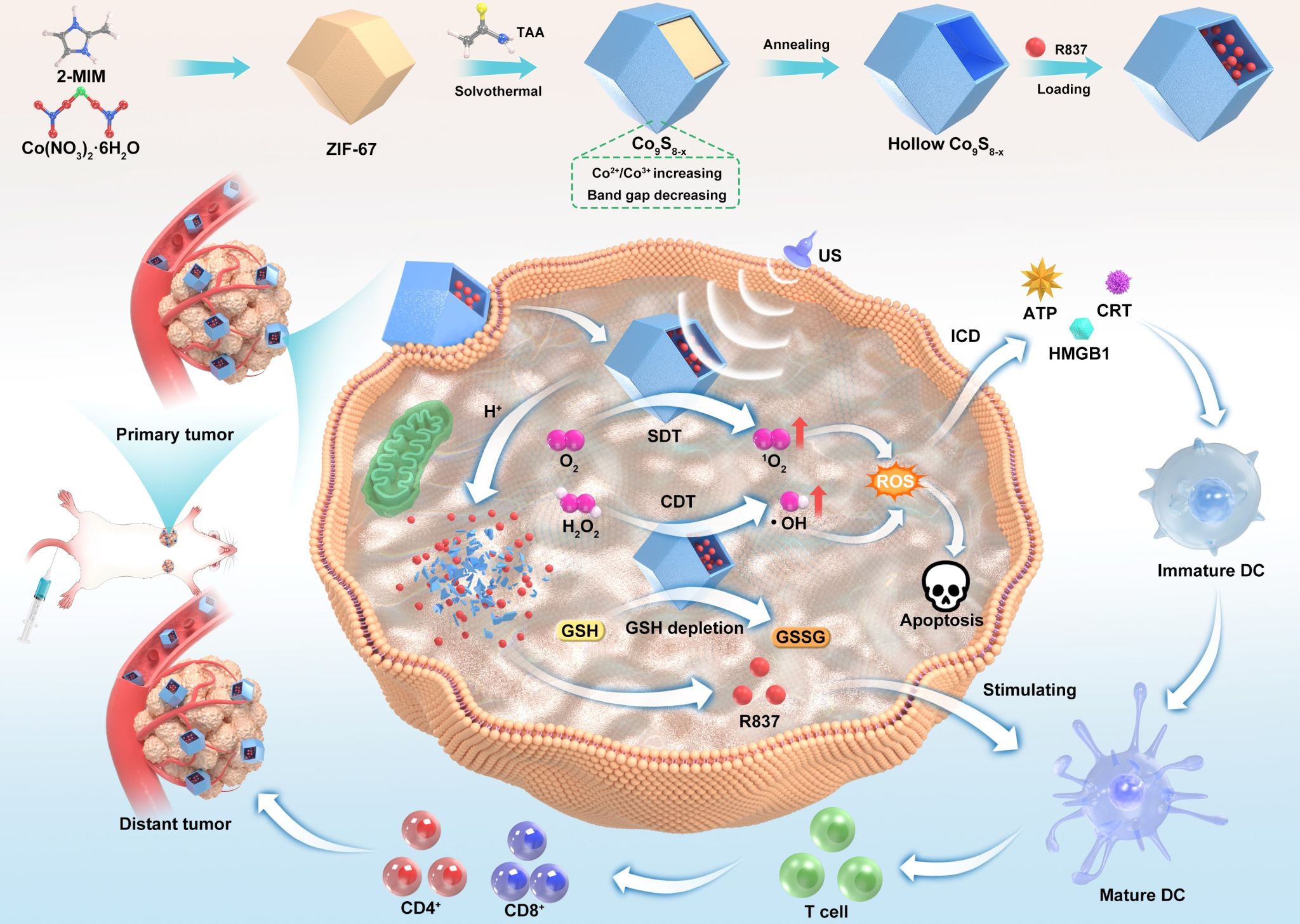我院潘登余/耿弼江研究团队首次报道了利用缺陷工程策略设计生物可降解的声酶系统用于增强的癌症免疫治疗。缺陷工程策略成功应用于调控Co9S8-x纳米笼中的硫空位,以探索硫空位依赖的声动力和化学动力学性能,并构建可生物降解的硫化物声酶系统,以增强癌症免疫治疗。该论文通过采用硫乙酰胺作为硫源和还原剂,调节其与钴源的质量比,通过热还原机制制备高水平硫空位掺杂的Co9S8-x纳米笼。由于引入了丰富的缺陷态,Co9S8-x纳米笼的带隙从2.06 eV减小到1.54 eV。与此同时,Co2+与Co3+的原子比在热还原的过程中从1.53提高到1.97,从而极大的增强了Co9S8-x纳米笼的类芬顿反应活性。因此,Co9S8-x纳米笼的声动力活性、化学动力学性能和抗肿瘤免疫响应可以通过缺陷工程策略显著放大。肿瘤微环境特异性降解的特性使得Co9S8-x纳米笼既可以保持大的初始尺寸用于增强的肿瘤组织富集,又可以在肿瘤微环境中巧妙地释放出Co2+、Co3+和免疫佐剂R837,以实现肿瘤积聚并促进肿瘤的深度穿透。利用上述特性,缺陷工程设计的Co9S8-x纳米笼可以通过ROS产率的级联放大引发免疫原性死亡,促进树突细胞成熟,并最终实现对T细胞的激活。体内双侧肿瘤模型证明了Co9S8-x纳米笼可以通过声动力/化学动力学治疗增强的免疫治疗将原发肿瘤完全消除,完全抑制肺转移,并可以通过强大的免疫反应减缓远端肿瘤的生长。该工作展现了利用缺陷工程设计生物可降解金属硫化物声酶系统重塑肿瘤微环境用于强大的声免疫治疗的潜力。