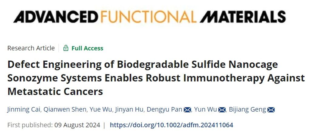 近日,我院硕士研究生蔡金明在导师潘登余和耿弼江的指导下,以第一作者身份在国际高水平期刊《Advanced Functional Materials》(IF:18.5)上发表题为“Defect Engineering of Biodegradable Sulfide Nanocage Sonozyme Systems Enables Robust Immunotherapy against Metastatic Cancers”的研究论文。