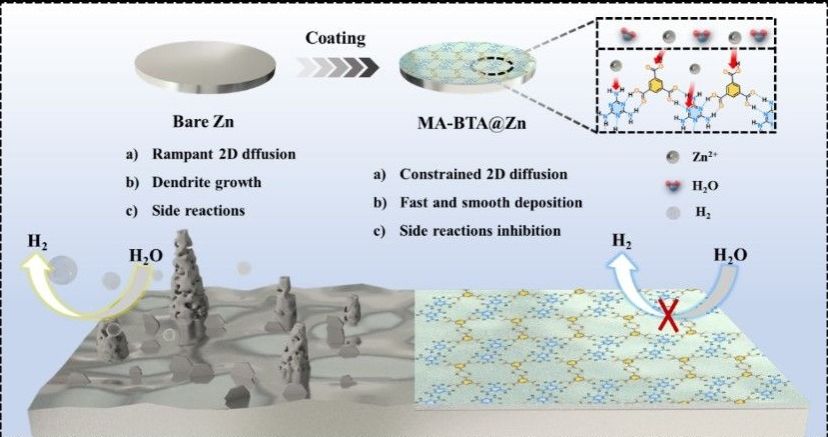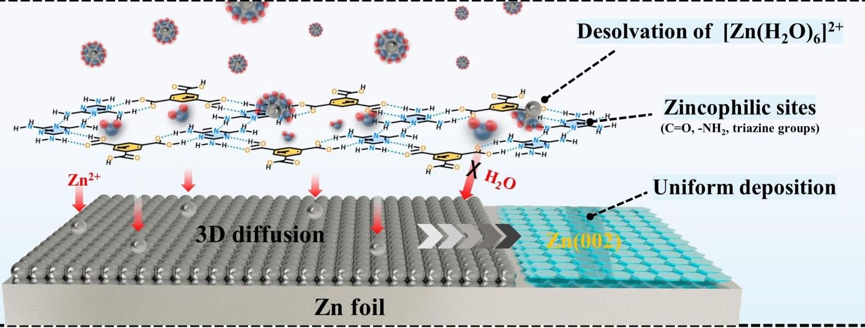 水系锌金属电池(AZMBs)具有理论容量高、环境友好、成本低、安全性高等诸多优点,被认为是极具潜力的下一代储能系统。然而,锌金属负极面临的枝晶生长和严重副反应这两大问题,阻碍了其实际应用的进程。枝晶生长问题和锌负极上严重的副反应是高度相关的,锌枝晶的生长会暴露更多表面,加速副反应,而这一过程也使锌负极变得更粗糙,从而导致更严重的枝晶问题。同时解决这些挑战对于提高AZMBs的性能和使用寿命来说十分关键。因此,设计一种既能促进均匀锌沉积又能抑制锌电极副反应的多功能涂层至关重要。