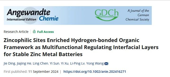 近日,我院化工系硕士研究生丁洁在《Angewandte Chemie International Edition》上发表题为“Zincophilic Sites Enriched Hydrogen-bonded Organic Framework as Multifunctional Regulating Interfacial Layers for Stable Zinc Metal Batteries”的研究论文,指导老师为吕丽萍副教授、王勇教授。