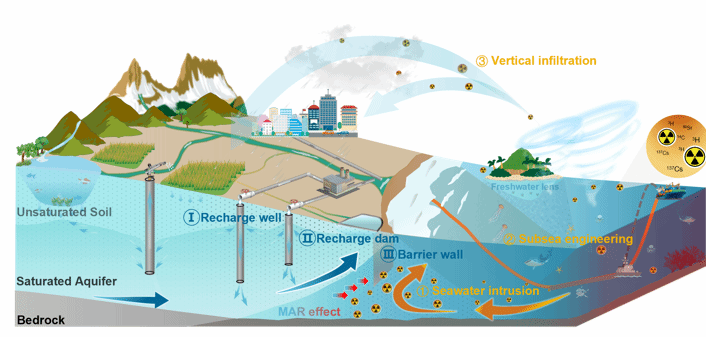 图2:海洋核污水对海岸带地下水的潜在威胁路径包括:①海水入侵,②海底工程设施管道渗漏,③垂直下渗。这些路径使放射性污染物可能穿透土壤层,进入深层含水层,危及地下水水质和人类健康。防护措施以人工地下水补给(MAR)技术为主,主要包括补给井、补给坝和阻隔墙,可以有效预防核污水的潜在危害。