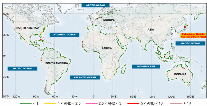 图1:全球海岸带海水入侵加剧陆地地下水环境影响程度。与2000年相比,2100年海水入侵楔将进一步向内陆推进。