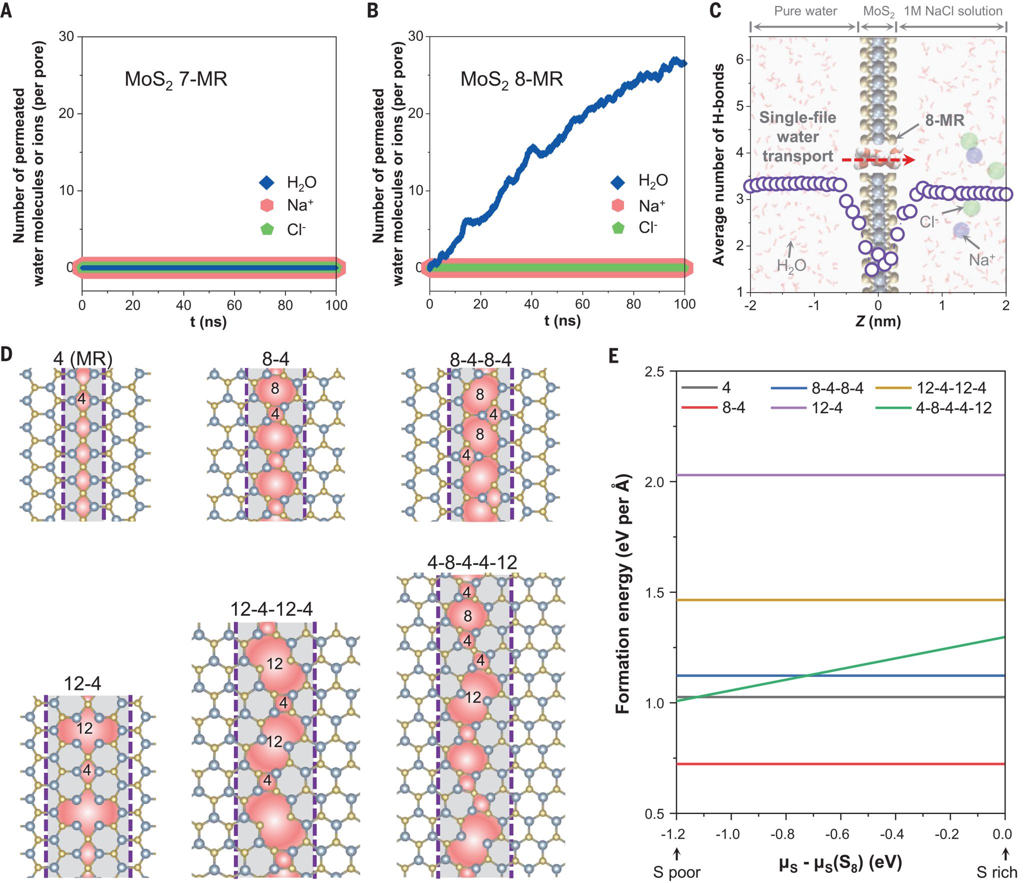 研究团队结合分子动力学模拟和密度泛函理论计算,揭示了单层MoS₂晶界处形成的八元环(8-MR)孔结构的尺寸筛分效应,该孔径能够允许单链水分子快速通过,同时完全阻止水合离子(如Na⁺和Cl⁻)的通过。因此,单层MoS₂晶界处形成的八元环(8-MR)孔结构可以作为分子筛,有效分离水和离子。实验过程中,研究团队通过精确控制MoS₂晶粒的生长方向(固定0°或60°的相对取向),成功在大面积单层MoS₂膜中实现了丰富的8-MR孔结构。通过进一步调节晶粒生长时间、硫蒸气压力等参数,实现了对晶粒尺寸和晶界密度的精确调控。优化后的MoS₂膜在多种测试条件下展现出优异的性能,如高水渗透性、高离子选择性以及良好的机械和化学稳定性。这使得其在海水淡化、污水处理等领域具有广阔的应用前景,为二维材料在分离膜领域的应用提供了新的思路。该方法不仅能够精确控制孔结构,还能实现大面积连续膜的制备,具有重要的实际应用价值。