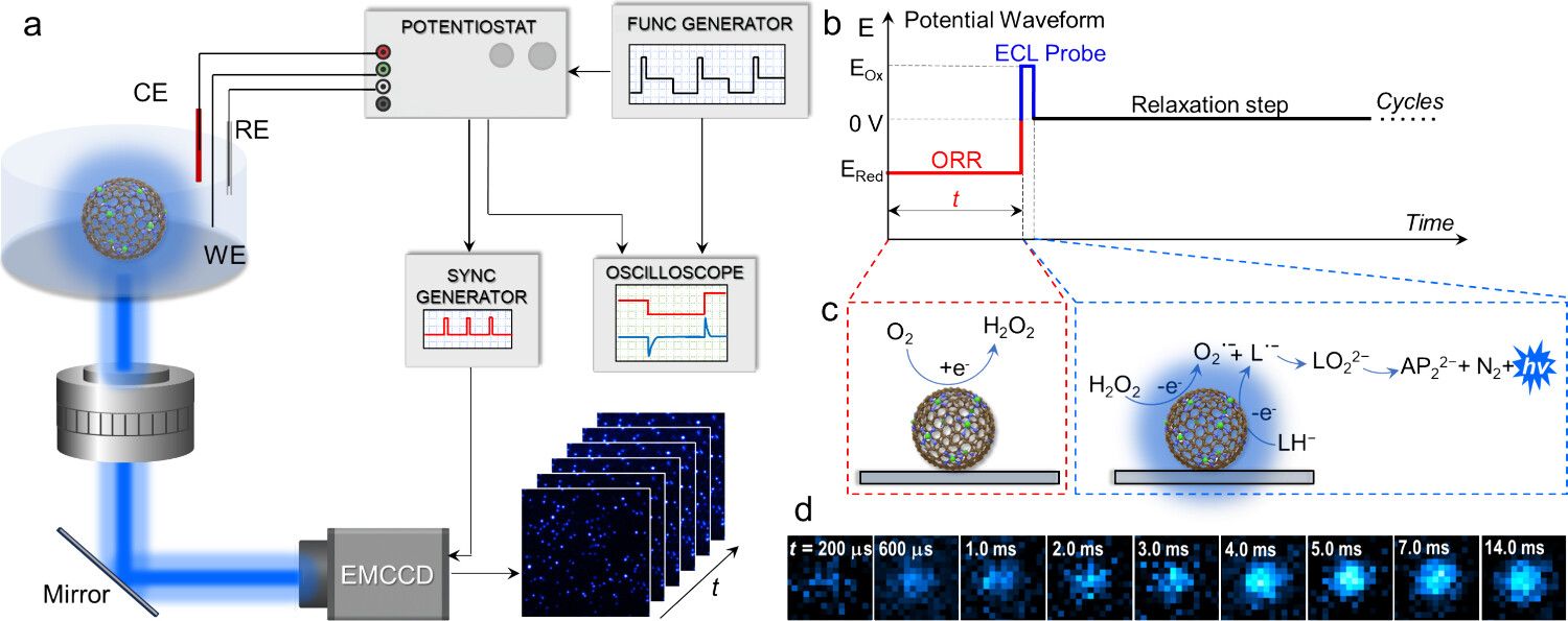 赵微教授团队报道了一种创新的瞬态电致化学发光显微成像技术(Transient ECLM),首次实现了对单原子催化剂表面氧还原反应(ORR)建立过程的实时动态成像。研究团队构建了一种双脉冲弛豫新策略,将其与电致化学发光成像结合,利用电致化学发光信号完全来源于电子转移反应的特点,成功将传统电化学中受充电电流掩盖的微弱法拉第电流信号转化为可探测的光子信号,从而实现了微秒时间分辨率的单颗粒动态成像。该方法首次清晰展现了ORR在纳米催化剂界面由非反应态向动态平衡态建立的完整过程。团队进一步提出了一个新动力学参数——法拉第反应建立特征时间(τest),用以定量描述电催化界面达到稳态反应所需的时间尺度,为研究电催化反应的瞬态动力学提供了全新的量化工具。