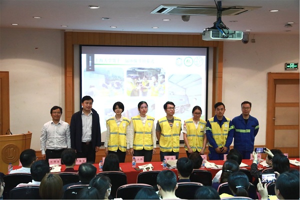 紧接着,闭幕式现场举行了365英国上市公司"黄马夹"环保志愿者团队出征仪式。胡大伟老师、孟祥栋老师、王骥先生以及李端先生为环保志愿者团队代表李嘉懿、张齐、唐佳康、占涛穿上"黄马夹",并鼓励志愿者团队勇立时代潮头,争做时代先锋,用实际行动做环保事业的奋斗者和奉献者。在本届环保节中,广大教师积极参与"一日减排大作战"活动,闭幕式上学生代表秦浩向在场的所有领导、嘉宾、同学宣读了本届环保节"一日减排大作战"的成绩单。
