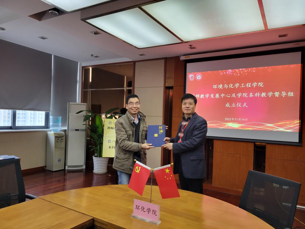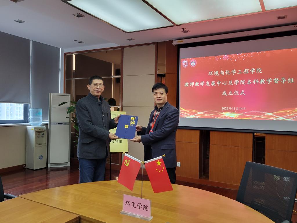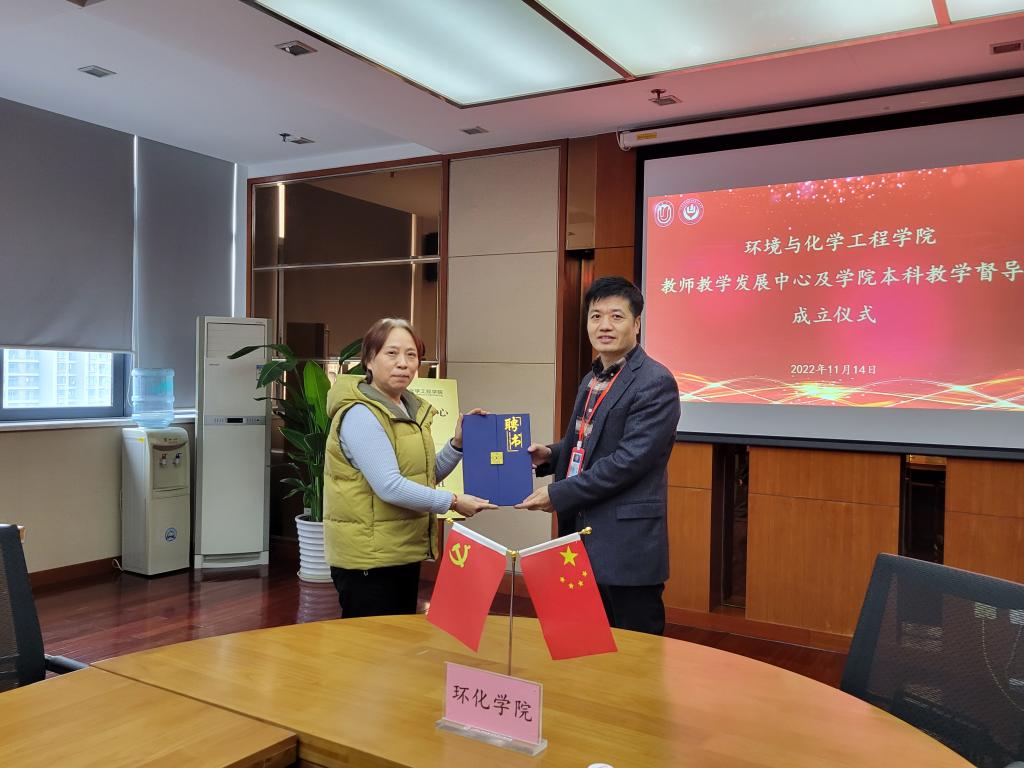 首先,党委书记钱冬英致欢迎辞,对学校教务部对环化学院本科教学工作的指导与帮助及奋战在教学督导第一线的老师们表示衷心的感谢。钱冬英指出,习近平总书记在党的二十大报告中,首次把教育、科技、人才进行“三位一体”统筹安排、一体部署,极具战略意义和深远影响。科技支撑、人才支撑的核心是教育支撑,学院教师教学发展中心和教学督导组的成立将大力推动学院本科教学质量提升,为培养勇担生态文明建设重任的卓越创新人才创造良好条件。随后,辛明军主任和钱冬英共同为学院教师教学发展中心揭牌,常务副院长王勇向学院教学督导组成员胡龙兴、张晓岚和潘登余老师颁发聘书。学院教学督导组组长胡龙兴老师围绕工作目标、工作模式、工作理念三方面做了受聘发言。