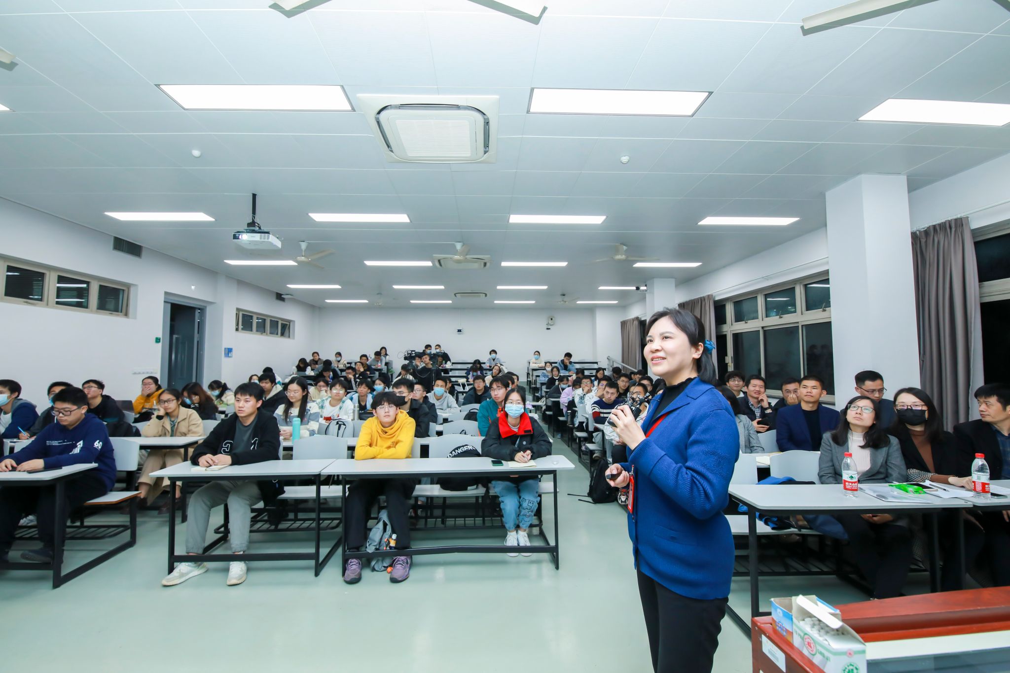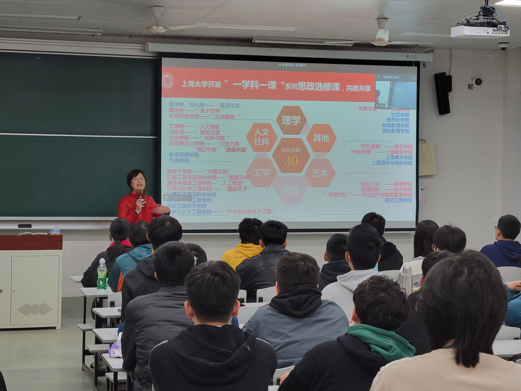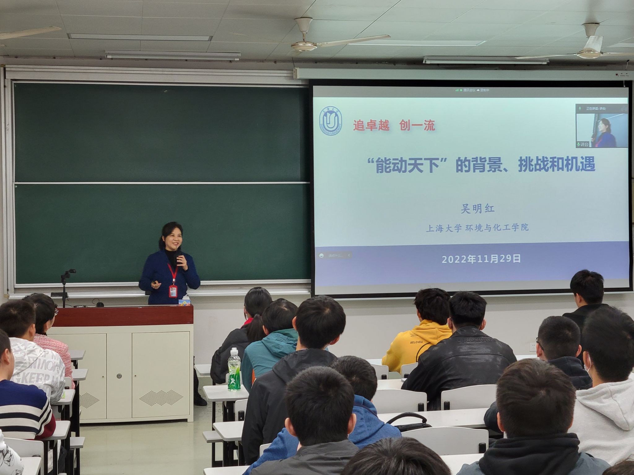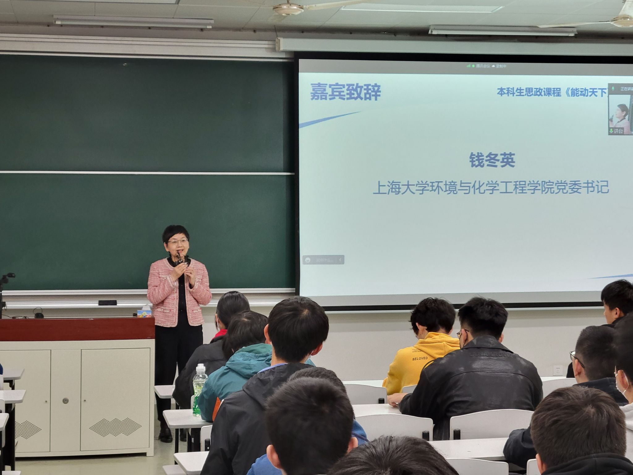 教务部副部长、教育部课程思政教学研究示范中心负责人、大国方略多个系列精品课程总策划顾晓英教授首先进行了暖场。她给选课的学生们介绍了“能动天下”作为“理论中国”系列之新课的诞生故事。课程注重依托高新科技学科视角讲述“双碳”和习近平生态文明思想,旨在让党的二十大精神“冒着热气”、“更接地气”走进学生心里。