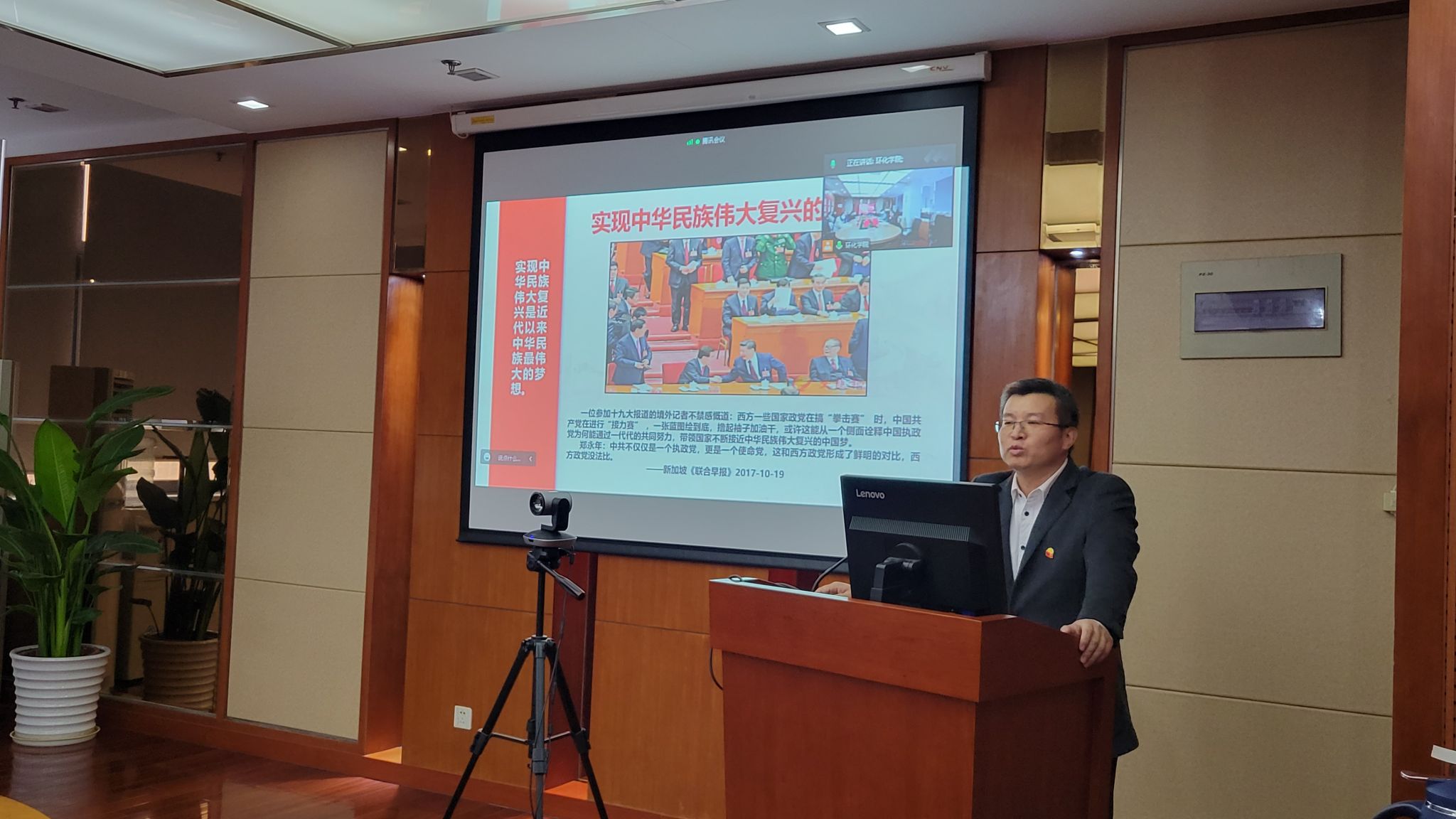 徐义圣副处长做了题为“学思践悟二十大 踔厉奋发新征程”的报告。报告以二十大的召开背景以及大会主题为引,围绕“党的二十大举世瞩目意义深远”“党的二十大报告结构核心要义”“以伟大自我革命引领伟大社会革命的重要要求”“以中国式现代化推进中华民族伟大复兴的使命任务”四个方面,对二十大精神进行了深入解读。在报告过程中,徐老师引经据典,旁征博引,将古今中外的故事、论述等与中国具体实际、党的建设等相结合,为与会人员深刻理解和准确把握二十大精神提供了思路和指导。报告最后,徐老师勉励在座师生牢记总书记的嘱托,为全面建成社会主义现代化强国、以中国式现代化全面推进中华民族伟大复兴而不懈奋斗。