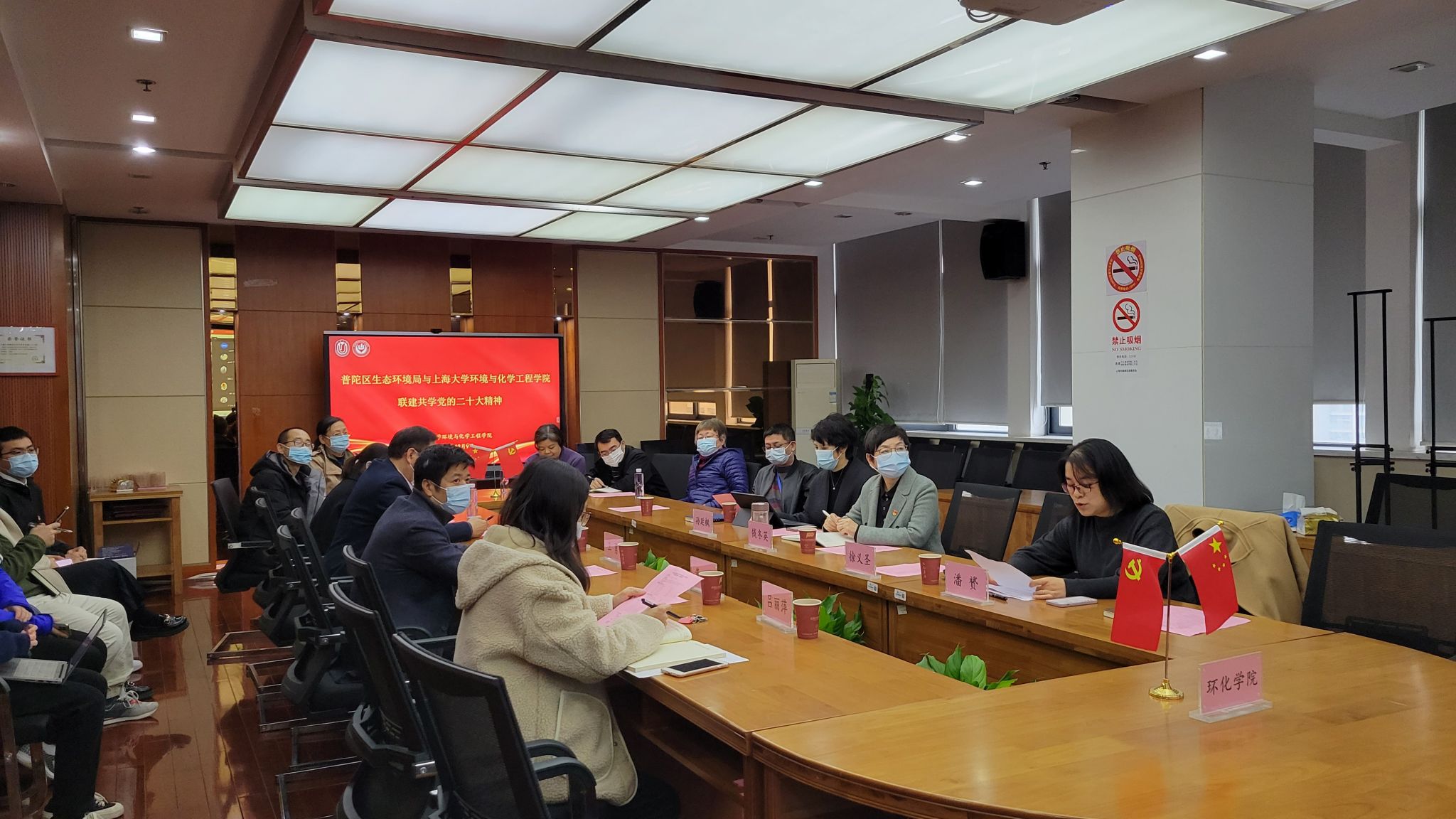 在认真聆听报告后,与会嘉宾进行了深入探讨交流。朱靖琼副局长介绍了普陀区生态环境局在开展二十大精神学习活动、落实降碳目标与提升治污能力方面的举措;潘赟副书记回顾介绍了近两年来,环化学院与普陀区生态环境局在人才培养、志愿服务、绿色扶贫、生态文明理念宣传等方面开展的合作;环化学院党委副书记孙延枫介绍了学院开展党的二十大精神学习的相关情况。双方共同表示,希望通过联学共建打破合作壁垒,在科技创新、成果转化等领域产生更多更好合作,为推动绿色发展、实现人与自然和谐共生贡献力量。