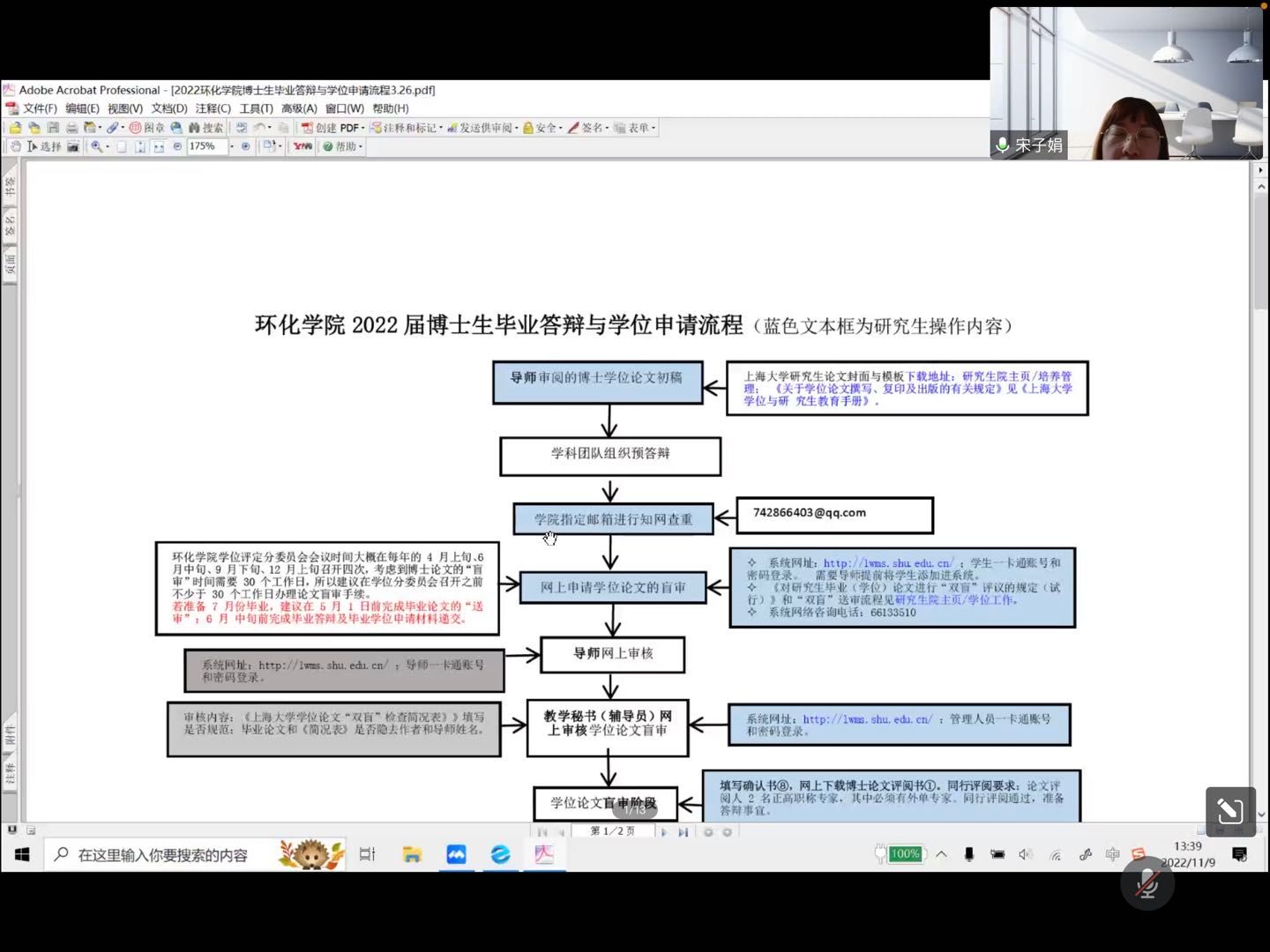 接着,宋子娟老师对毕业论文所涉及的流程以及注意事项进行了详细的讲解。她重点向毕业生们介绍了最新的盲审政策,并提醒同学们要认真对待盲审流程,有遇到困难的地方要及时与导师及教学秘书沟通。宋老师也向博士毕业生介绍了毕业答辩与学位申请流程,并提醒他们认真注意各项流程,在规定时间内提交相关材料,从而顺利、按时毕业。