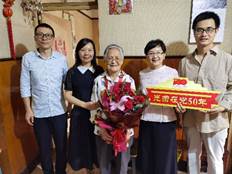 在庆祝中国共产党成立100周年之际,环化学院党委书记钱冬英带队,赴静安区、黄浦区开展“七一”走访慰问,为赵根妹、孙梅林和施其瑛三位老党员颁发“光荣在党50年”纪念章,并送去组织的关怀和温暖。