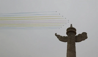 天安门广场上发生的每一秒都很震撼:空中护旗梯队上悬挂的4句巨幅标语;飞机编队呈100字样飞跃广场;10道彩烟辉映长空庆祝建党百年;100响礼炮响彻云霄;踏着整齐步伐的国旗护卫队们……每一位在座师生不禁深深震撼于中国之速度。