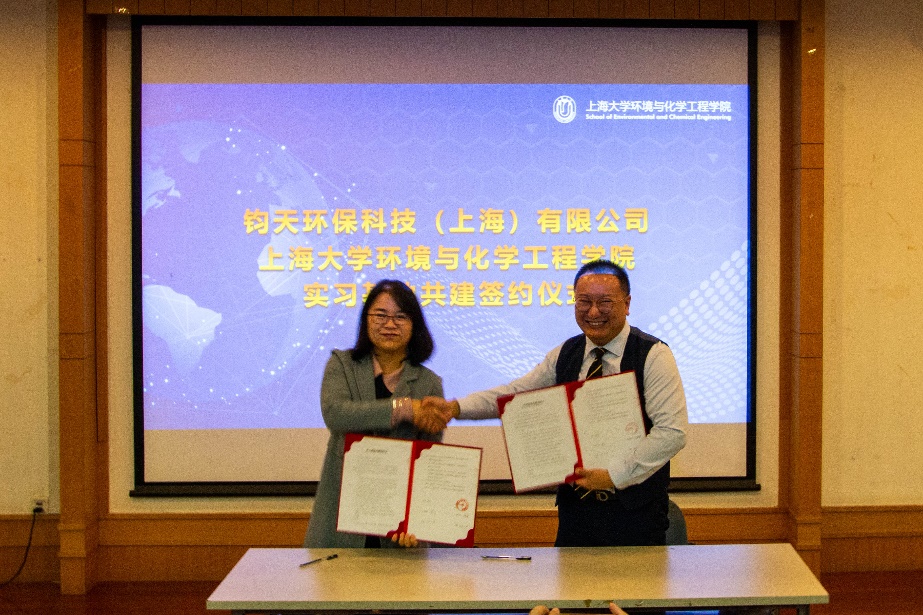 随后潘赟老师与钧天环保科技(上海)有限公司董事长卢意先生进行现场签约。在对钧天环保表示衷心感谢的同时,也期待今后环化学院与钧天环保科技(上海)有限公司在环保领域开展深度合作。