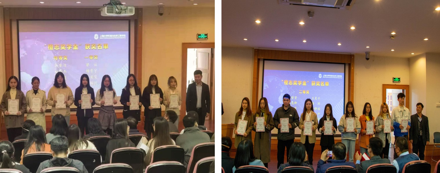 为更好地激励学生奋发学习,立志成才,365英国上市公司环化学院与橙志(上海)环保技术有限公司合作设立“橙志奖学金”。经过严格的评选,最终有杨哲贤等10位同学荣获橙志奖学金二等奖,高冰洁等8位同学荣获橙志奖学金特等奖与一等奖。