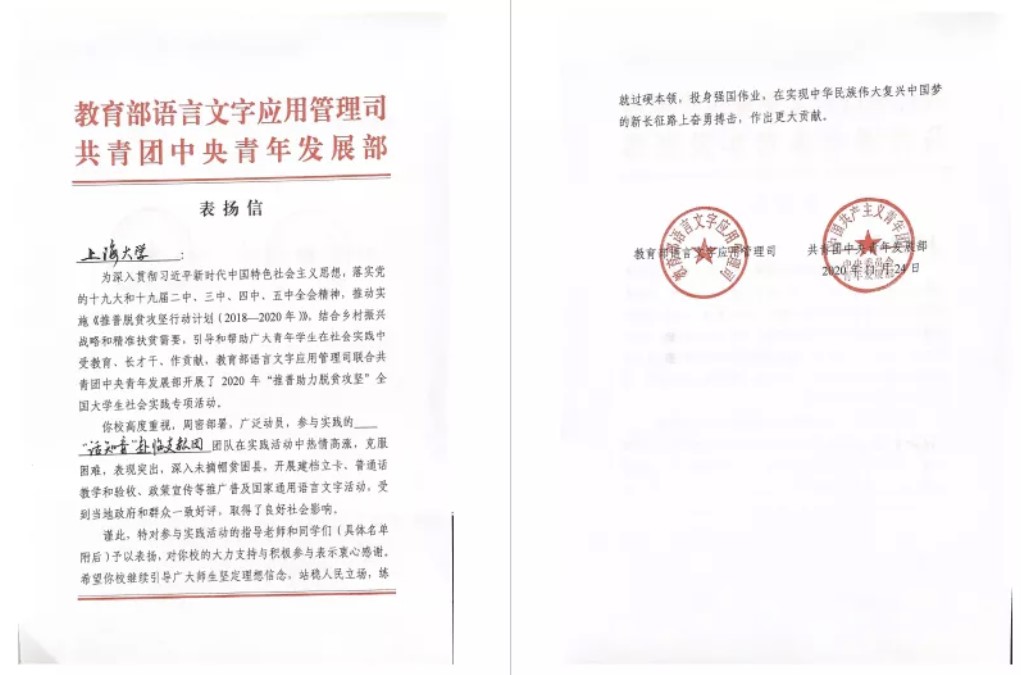 焦安兴曾三次带队前往甘肃省少数民族地区,开展扶贫调研和志愿推普工作,校园教学覆盖660人次。同时,她联络社会资源搭建线上云平台教学,为外出务工的青壮年劳动力提供实用普通话学习资源。在这片满载着支教人青春与信念的山川热土之上,她见证了党中央打赢脱贫攻坚战的决心和信心,更坚定了自己将“青春之花绽放在祖国最需要的地方,在实现中国梦的伟大实践中书写别样精彩的人生”的奋斗目标。