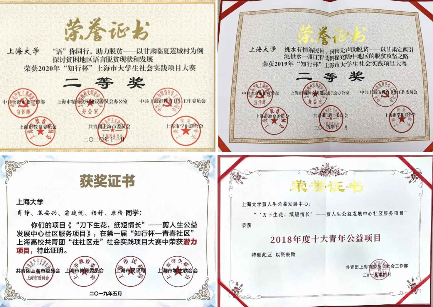 (5)2019、2020年“知行杯”上海市大学生社会实践项目大赛二等奖;