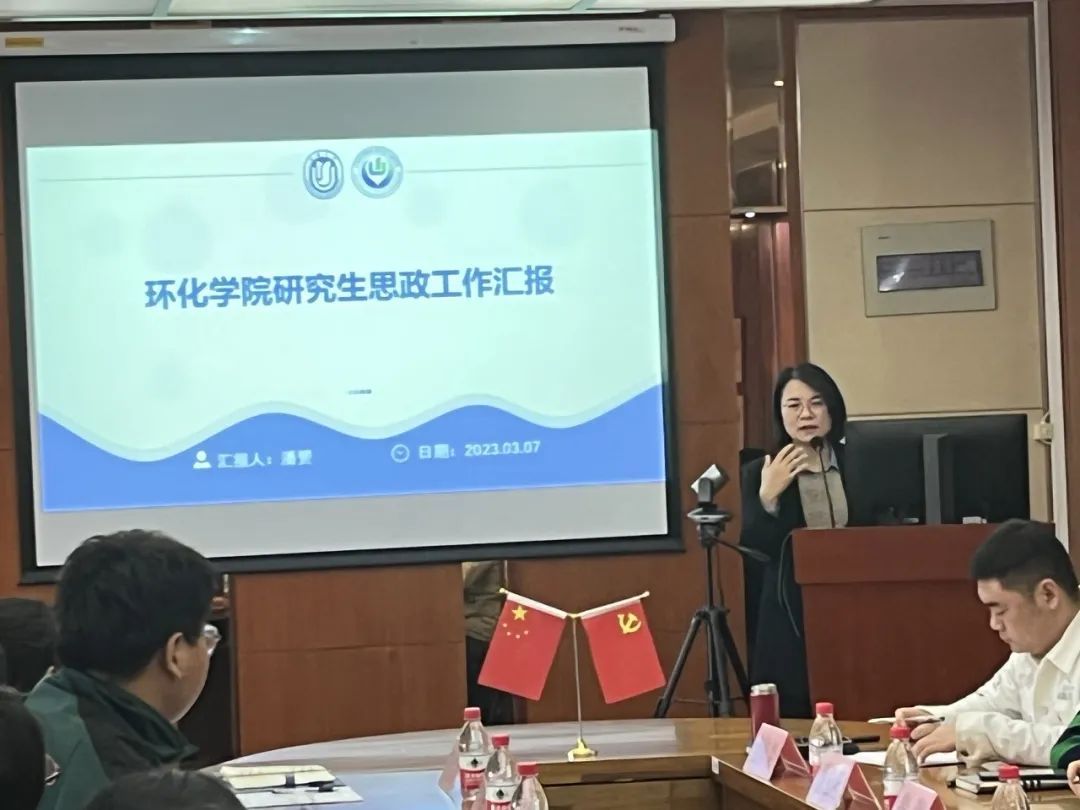 第三项议程中,潘赟老师对环化学院2022年研究生思政工作情况进行介绍。潘老师提到在研究生人数不断增加的趋势下,推出研究生班主任制度,可以合理优化教师资源,加强班级建设,涵育优良班风学风。她指出,要以辅导员队伍为主,联合班主任,与两系四所建立“一对一”联系制度,全面推进研究生参与创新创业竞赛。其次,要加强班级建设、明确班主任具体职责。依托班级,联动导学团队,加强校友联络,多方建立与知名企业的沟通渠道,建立专业相关企业数据库。依托学院“绿航”生涯规划指导工作室,组建青年教师生涯发展指导团队,开拓国际项目,提升学生国际视野,拓宽学生职业规划格局。班主任和班干部共同的目标就是将班级建设为助推学生成才、推动学院发展的活跃细胞。