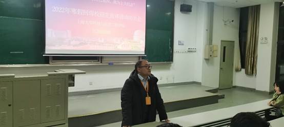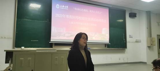 随后,潘赟老师向大家介绍了我校在江西招宣工作的开展情况,并回顾了江西招宣组在招生宣讲工作上取得的成果。她勉励同学们要尽职尽责完成招生宣讲工作,要积极宣传百年上大的历史与积淀,用自己的优秀向母校学子展示上大人的风采与骄傲,用自己的优秀吸引更多的青春力量赓续上大的红色血脉。