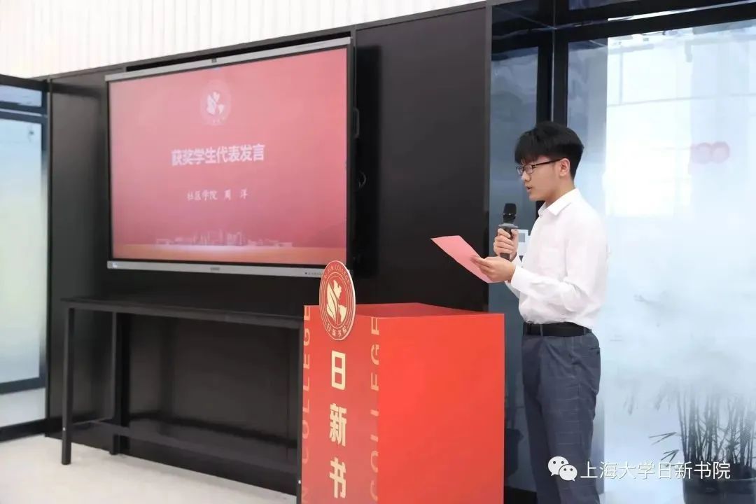获奖学生代表社区学院周洋发言,周洋同学感谢了斯瑞新材料股份有限公司对我校学子的支持和鼓励,对日新书院的学生培养工作表示感恩,相信同学们在日新书院这个充满活力的地方能够成就更好的自己。书院同时邀请了获奖研究生和大一获奖本科生进行结对,充分发挥朋辈育人作用,社区学院党委书记邓志瑞和材料学院院长董瀚为大家颁发结对证书。