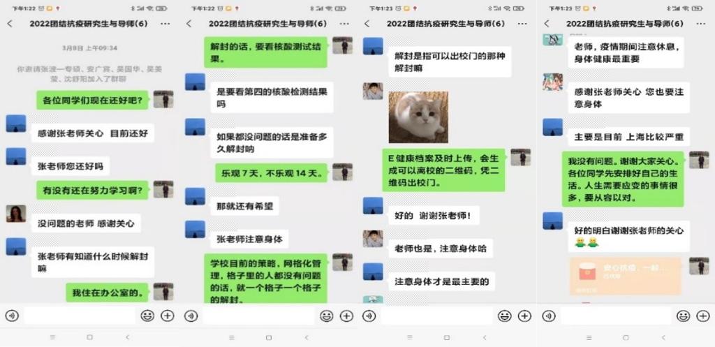 此外,系主任张宝华老师就目前校内情况及近期系里重点工作、教学副系主任孙炜伟老师就近期本科生相关工作、陈双强老师就近期科研相关工作进行了重申和部署,强调了疫情期间尤其要保质保量做好科研教学工作,同时要求要加强与师生群众的联系,及时了解师生的思想动态和生活工作困难。徐丽、宋子娟、罗稳、田玲、戴扬老师等也分别交流了各自社区的疫情情况,并分享了社区志愿服务及居家隔离期间防护注意事项。