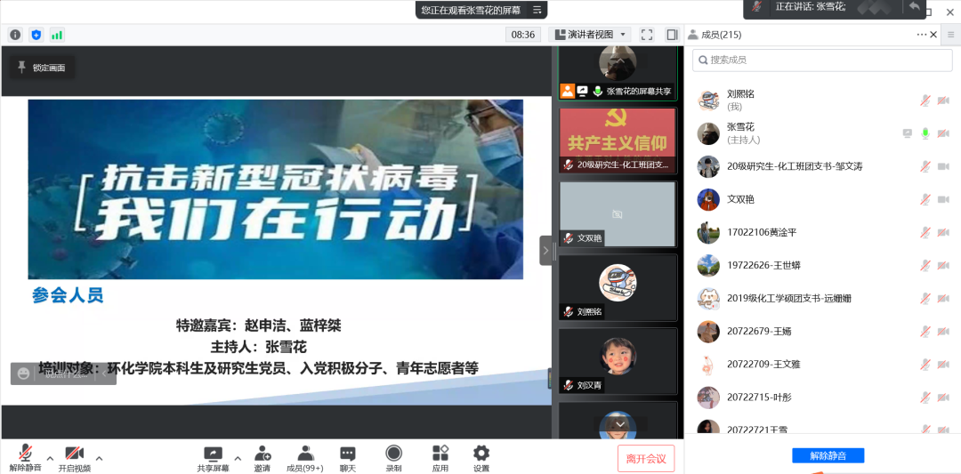 为响应校团委的号召,进一步加强对疫情防控志愿者的防护,做好青春守“沪”者的守护者,向青年志愿者加强自我防护提供更具体的建议,我院团委于4月7日19:30在线召开了疫情防控志愿活动专项培训会议。出席会议的有学院团委书记赵申洁老师,团委副书记蓝梓桀老师,本科及研究生党员、入党积极分子和青年志愿者。会议由研究生团总支书记张雪花担任主持人。