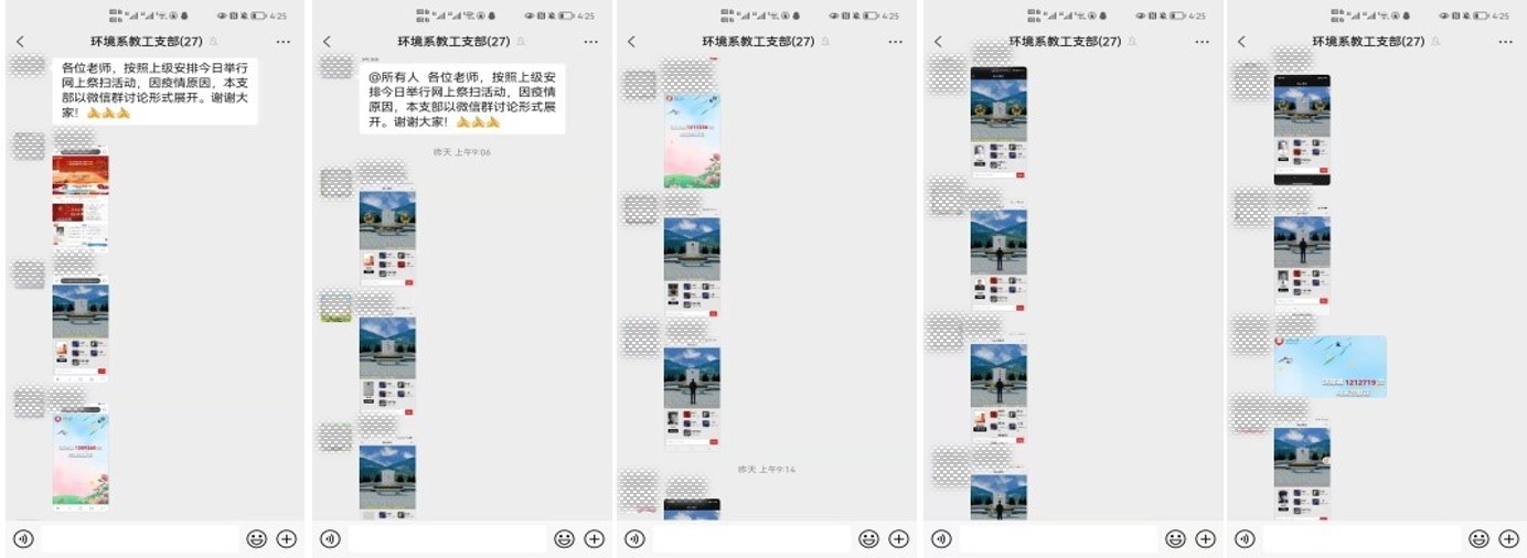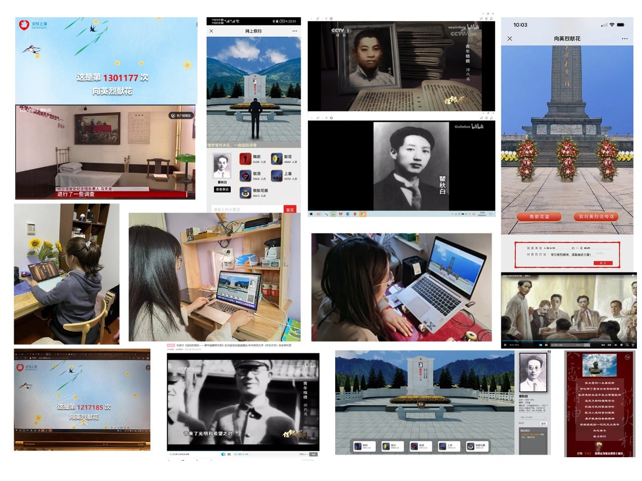 学院各教工党支部以微信群、腾讯会议等网络平台,分别开展“网上祭英烈”支部组织生活或线上学习活动,纪念先烈,铭记革命先辈们为国家和人民做出的牺牲与贡献。党员教师通过登录“中华英烈网”和“文明上海网”,开展学习英烈事迹、网上献花、祭拜、留言等祭扫活动,表达对英烈的哀思,一起重温《共产党宣言》,观看视频学习瞿秋白、邓中夏等革命先辈的英雄事迹,大家纷纷表示要继承先辈无私奉献精神,发挥党员同志模范带头作用,做到一个党员就是一面旗帜,服从疫情防控工作大局,积极参与学校和社区抗击疫情志愿服务,挺身而出,顽强奋战,用“红色堡垒”铸就疫情防控“红色屏障”。