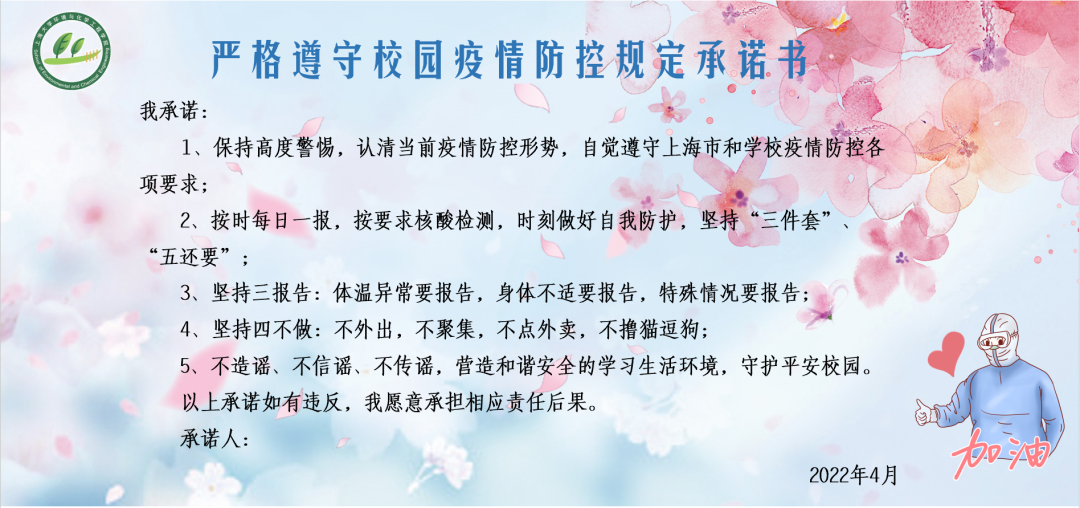 抗疫人人有责,在这场突如其来的疫情面前,没有人是旁观者,每个人都是责任人,不能有丝毫的懈怠。让我们一同响应学校和学院的号召,坚决配合疫情防控工作,坚定战胜疫情信心,以实际行动践行初心使命,争做疫情防控的参与者、健康校园的守护者。全体上大师生共克时艰、众志成城,我们终将会迎来春暖花开之时。
