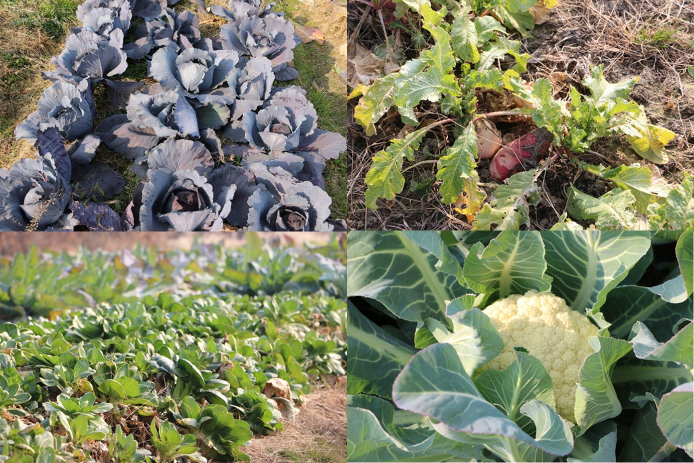 首先,我们随着胡老师走进了实验田区域。虽正值寒冬,田地里仍有蔬菜生长:紫甘蓝、萝卜、青菜、花菜等时蔬。
