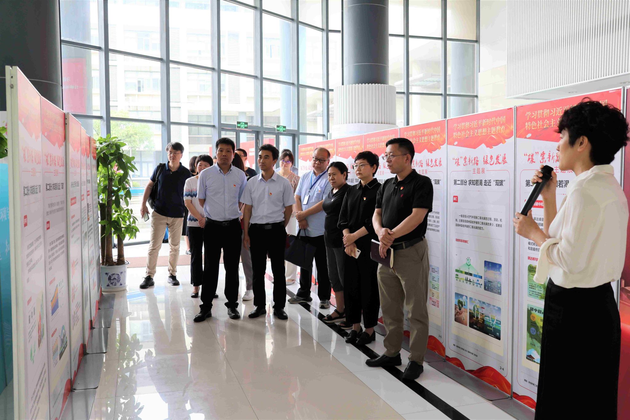联学活动上,各学院领导班子成员首先于环化楼一楼大厅参观了由校党委宣传部、科研管理部指导,环化学院与上海市嘉定区生态环境局共同主办的“‘碳’索新路 绿色发展”主题展,从“双碳”的热点知识、实现“双碳”的必要性、国内外对实现“双碳”的探索及未来“双碳”技术的发展方向等方面,深化对推动绿色发展、建设人与自然和谐共生的现代化的认识。参观过程中,环化学院党委副书记孙延枫讲解了主题展。