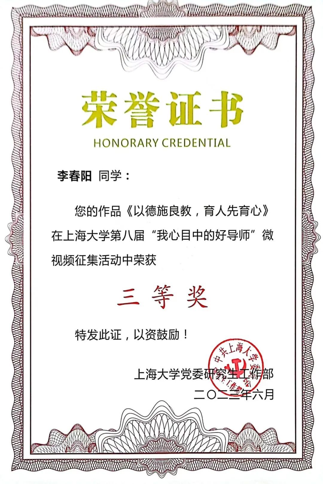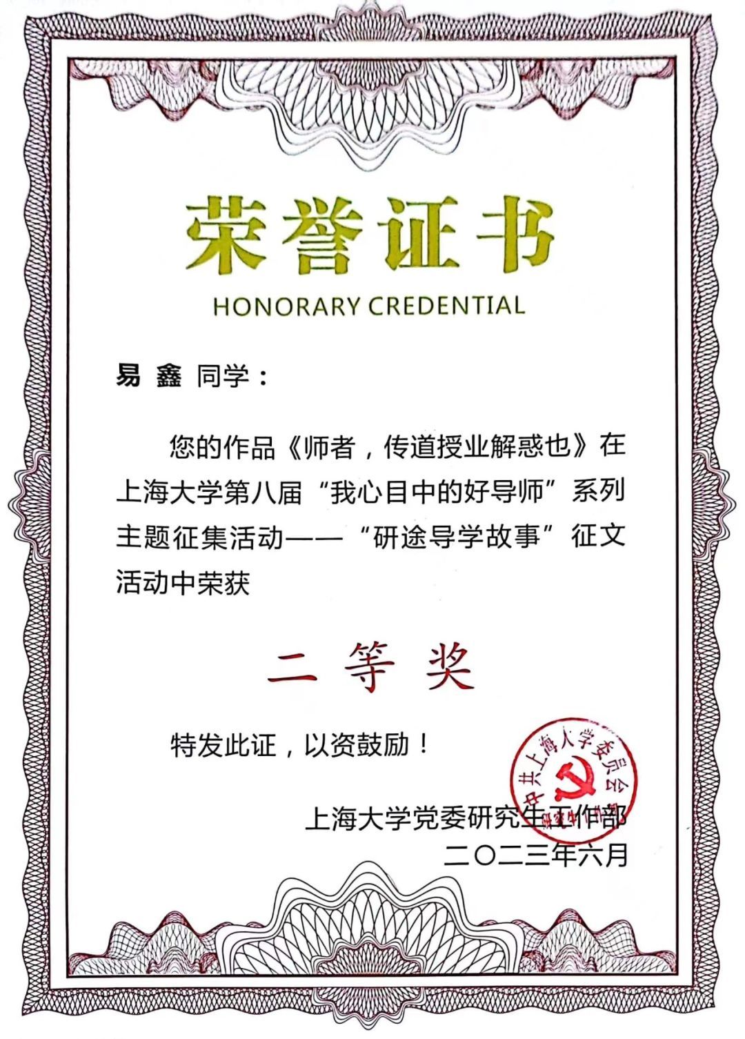 此外,为宣传一批“四有”好导师典型,树立校内良师益友的榜样,弘扬高尚师德师风,在本届“我心目中的好导师”评选活动期间,还开展了“研途导学故事”主题征文活动、微视频征集活动等X项子活动,有效拓展“1+X”导学育人平台,环化学院易鑫同学、李春阳同学在该活动中获奖。