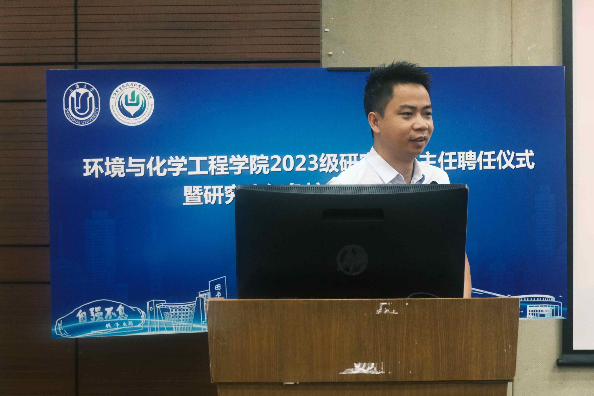 2023级环境科学与工程一班班主任邹权老师作为班主任代表发言,邹权老师首先介绍了个人学术工作经历,并对个人在学院工作内容做了阶段性总结,随后邹权老师提到作为班主任,他会积极推进班级建设内容,扮演好“桥梁”的角色,及时与同学们做好交流沟通、资源对接。邹老师强调,同学们要利用好学校图书馆资源,充分学习,要具备扎实的科研基本功,同时也要走进体育场,积极参与体育运动,保证自己的身心健康。