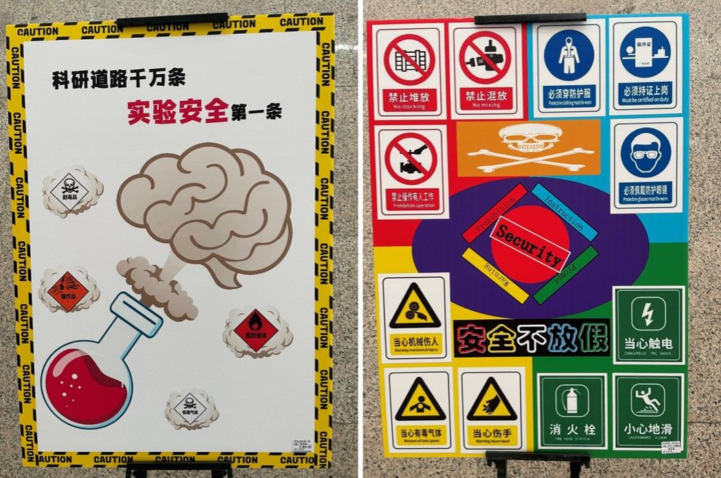 嘉年华活动包括实验室安全闯关区、实验室安全知识和典型事故案例警示教育展区、实验室安全海报大赛作品展区三个互动区。环化学院实验员、安全员老师与研究生志愿者参与策划了实验室安全闯关的趣味游戏,从引导师生识别潜在隐患、妥善存储试剂和选择正确的灭火器等角度出发,设置了隐患识别挑战、试剂存储智力挑战和灭火器选择决策三个游戏关卡,旨在让师生在趣味闯关游戏中收获实验室安全知识,增强应对潜在危险的能力,提升实验室安全意识。在实验室安全海报大赛作品展区,环化学院23级硕士研究生周丹、赵静茹、徐莹豪共同参与设计的两幅海报入选展示,海报中的安全标识元素向师生们传递了实验室的安全知识与安全理念。在整个嘉年华活动中,环化师生积极协调配合、维持现场秩序,为活动的顺利举行提供了有力保障,对提升广大师生的实验室安全文化素养起到了促进作用。