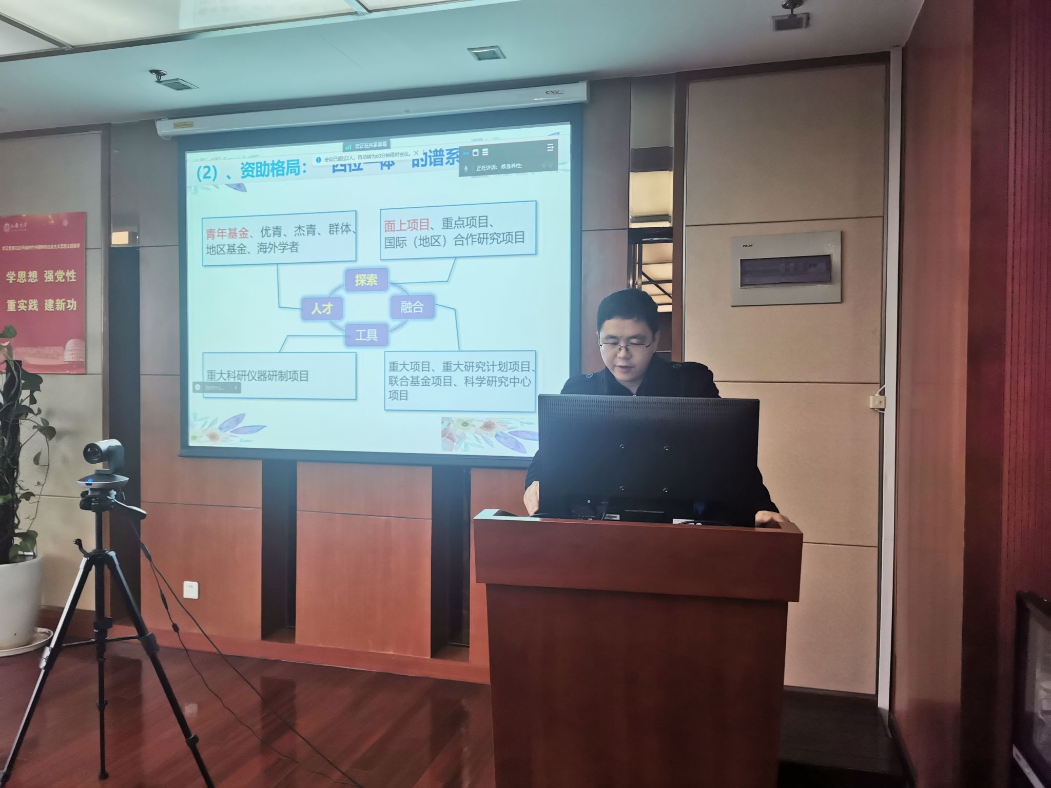 随后,复旦大学张峰教授做了关于《国家自然科学基金申报经验分享》的专题报告,从申请书的选题、立项依据、研究目标、研究内容等方面进行了深入地讲解,同时用典型示例形式重点介绍了大气科学学科申报书的撰写要点。会后线上和线下参会老师积极热烈地提问并讨论,张教授也细心认真地一一作答。