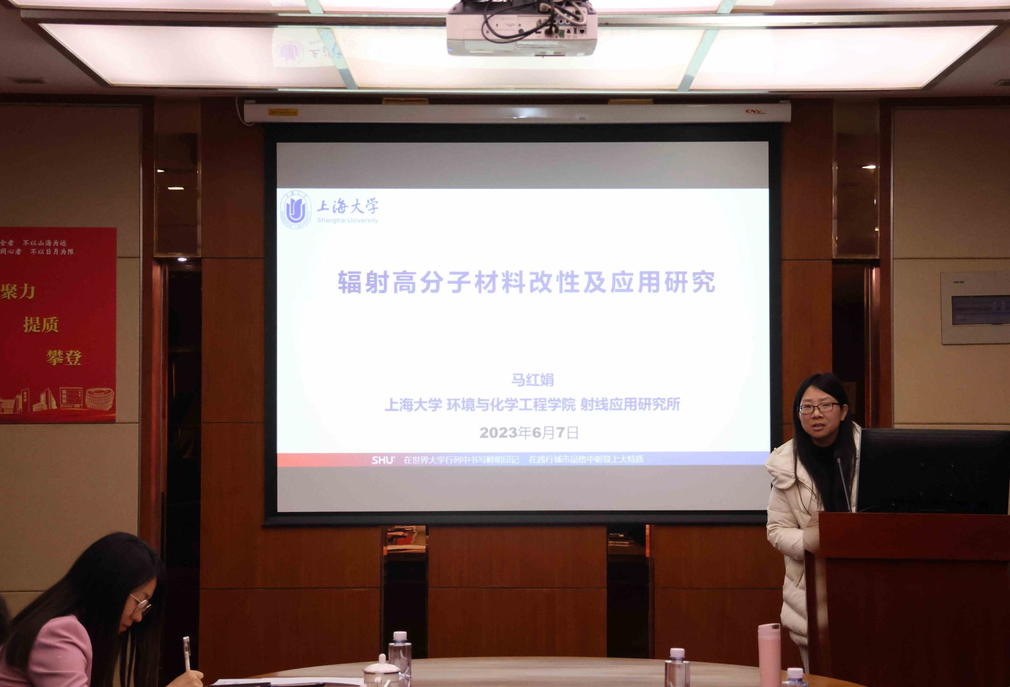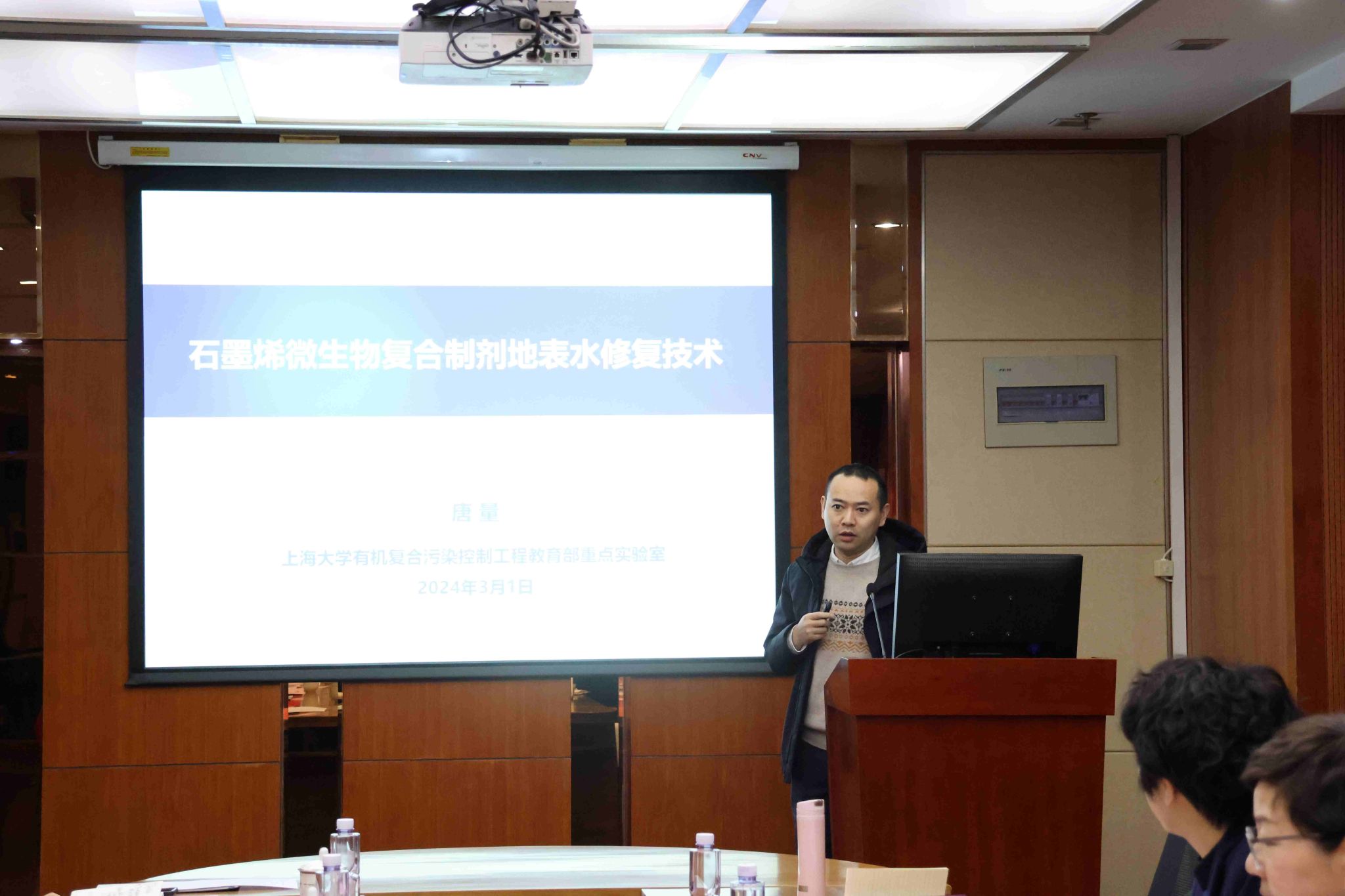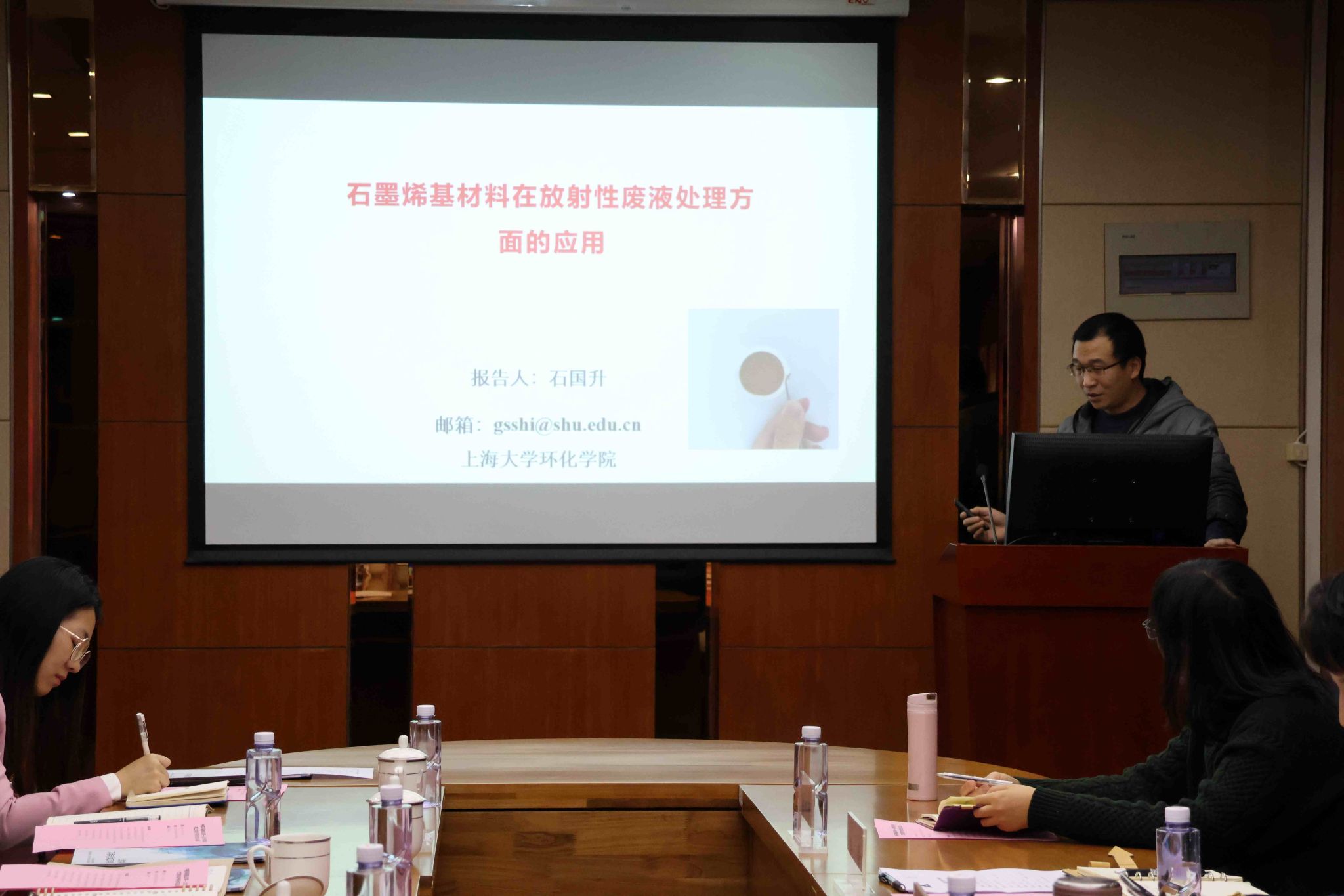 交流会上,钱冬英向赵翼鑫总经理一行的到来表示热烈的欢迎和诚挚的感谢。随后,与会双方共同观看了环化学院和中核环保有限公司的宣传片。中核环保有限公司曾毅君副总接力介绍了公司的发展情况及重点业务板块。有机复合污染控制工程教育部重点实验室常务副主任唐量研究员、学院副院长石国升研究员、学院射线应用研究所马红娟研究员分别做“石墨烯水处理技术”、“海水淡化及高放废水处置技术”及“海水提铀等技术”汇报,与会双方围绕核污染防治、水污染治理、土壤污染治理等方面展开了深入的交流。
