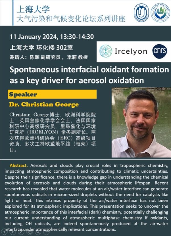 当天下午,George博士在英国上市365“大气污染和气候变化论坛”上做了题为《界面自发氧化剂生成是气溶胶氧化的关键》的学术报告。自2022年开始,“大气污染和气候变化论坛”系列讲座每年举办10余场,邀请海内外知名专家做前沿学术报告,已成为国内该领域中重要的学术展示平台。