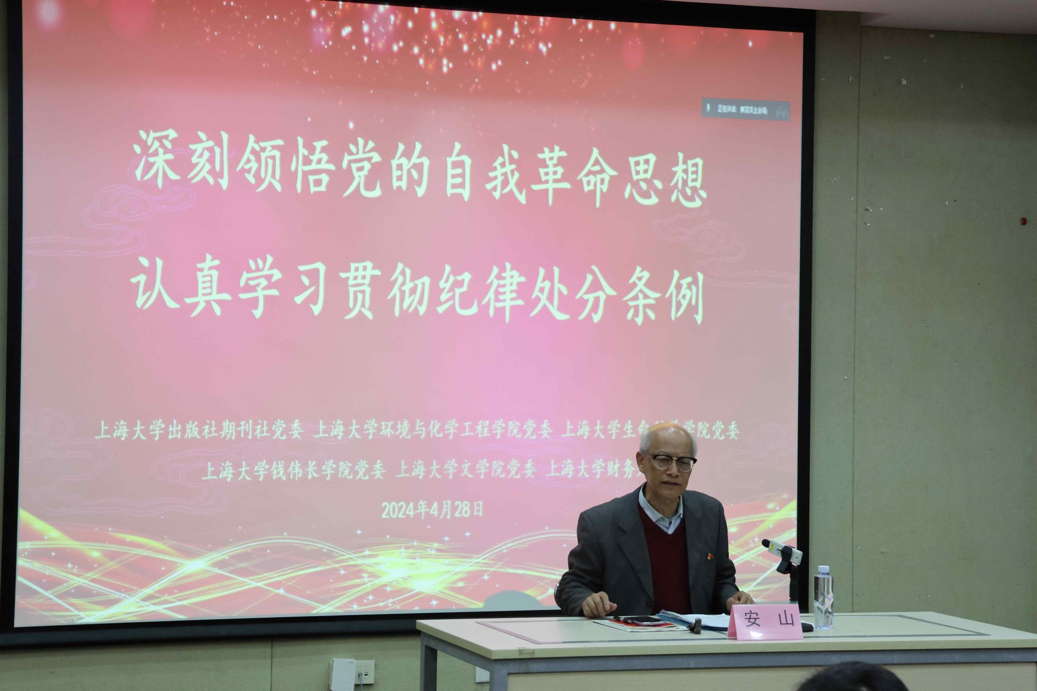 为全面深入推进党纪学习教育,教育引导全体党员学纪、知纪、明纪、守纪,4月28日,我院党委与出版社期刊社党委、生命科学学院党委、钱伟长学院党委、文学院党委、校财务处联合开展党纪学习教育活动,邀请学校特邀党建组织员、信访办原主任安山老师为全院师生党员作题为《深刻领悟党的自我革命思想,认真学习贯彻纪律处分条例》的主题报告。学院全体教工党员在蔡冠深讲堂集体参加学习,学生党员在线上同步学习。