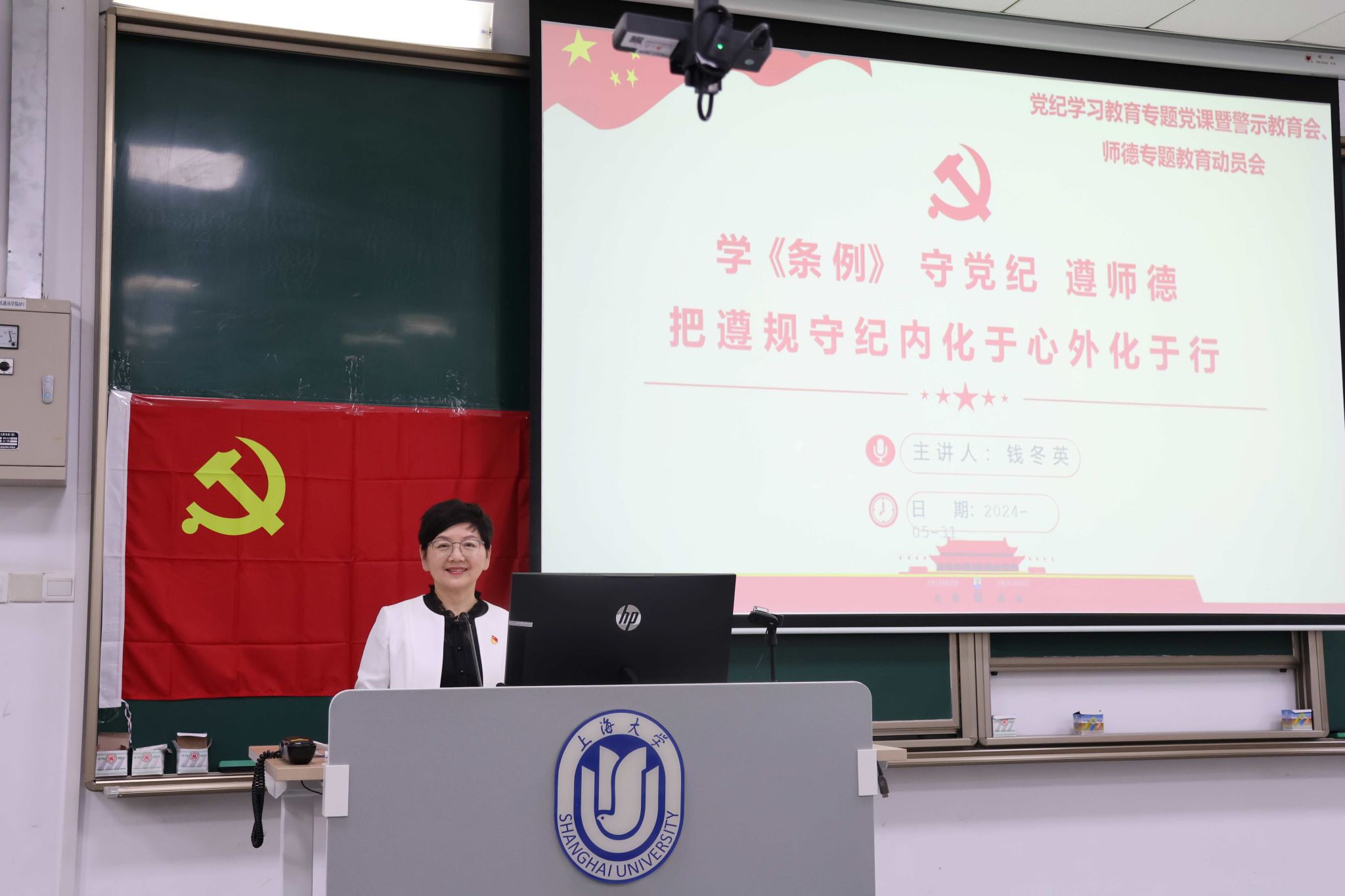 大会期间,环化学院党委召开了党纪学习教育专题党课暨警示教育会、师德专题教育动员会。钱冬英以“学《条例》 守党纪 遵师德 把遵规守纪内化于心外化于行”为题,带领与会党员回顾了党纪学习教育的提出过程、《中国共产党纪律处分条例》的历次修订情况、《新时代高校教师职业行为十项准则》等内容,并结合与高校教师相关的案例,解读了《条例》中“六大纪律”和《十项准则》中的具体要求,教育引导党员以案为鉴,守牢规矩底线,共同营造风清气正的干事创业氛围。会上,学院党委结合本次培训,对与会党员关于《中国共产党纪律处分条例》及《新时代高校教师职业行为十项准则》的学习情况进行了现场测试。