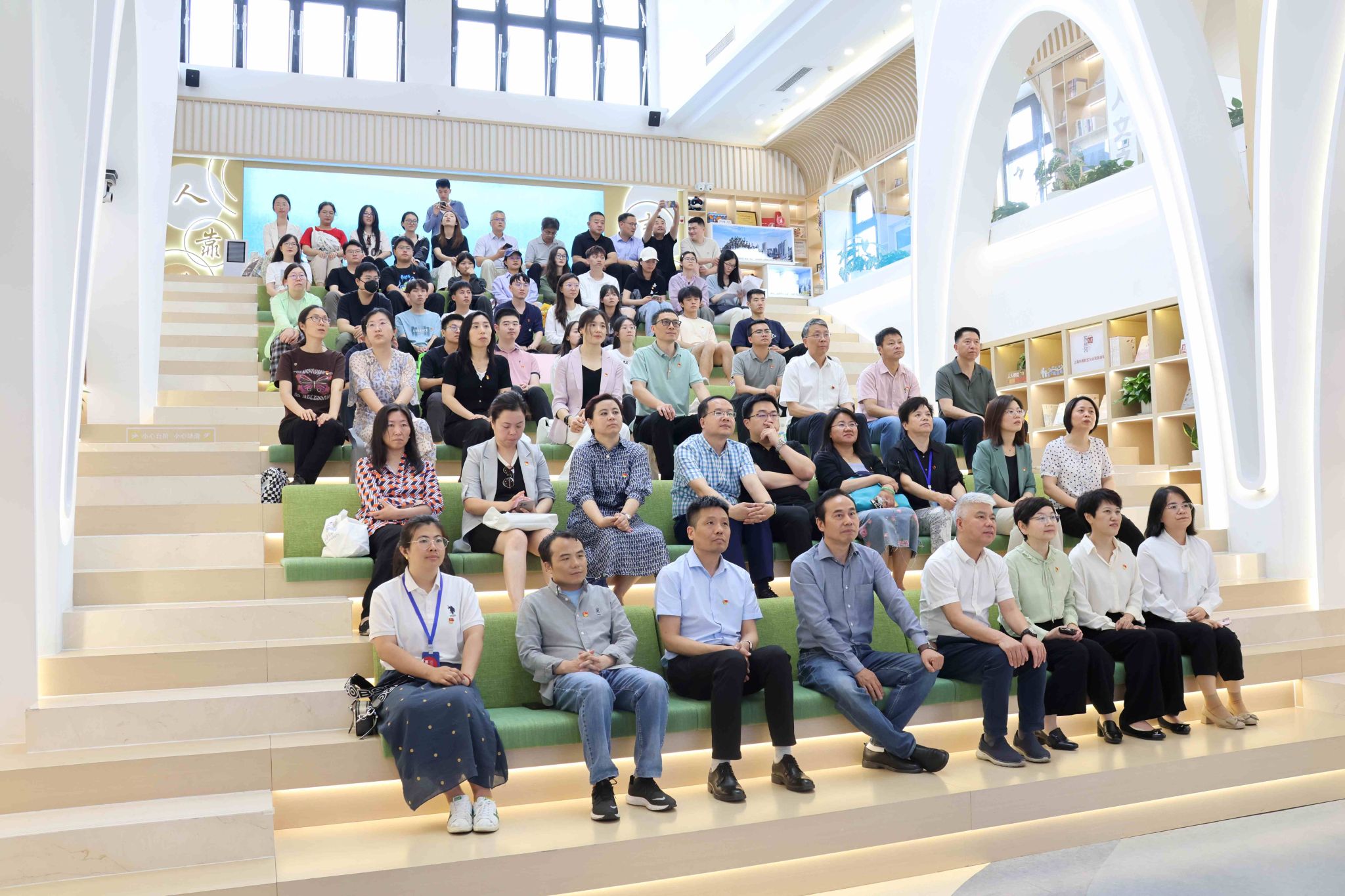 本次联学活动第一站来到普陀区半马苏河驿站党群服务中心。在参观过程中,大家认真聆听工作人员的介绍,不时驻足观看、交流讨论。通过展示区的视频介绍和图文讲解,大家深入了解了半马苏河驿站党群服务中心的丰富功能和重要意义,对党群服务中心以党建引领为核心,整合各类资源,为党员和群众提供多元化、个性化服务,在推动区域发展、促进社会和谐等方面所发挥的积极作用有了更深入的了解。此次参观活动,让参加现场学习的党员们深刻感受到,半马苏河驿站党群服务中心所蕴含的强大红色力量和普陀温度,中心不仅是普陀区党建工作的重要阵地,更是凝聚党心民心、服务党员群众的温馨家园。大家纷纷表示,将以此次参观为契机,进一步增强对党建工作的认识和理解,学习普陀区“人靠谱、事办妥”的普陀精神,加大与普陀区“中华武数”重大科创平台的合作与交流,在今后的工作和生活中,积极发挥党员的先锋模范作用,以科技协同创新推动校地企深度合作,激发推动发展新质生产力的强大动能,为上海市和长三角区域的发展贡献自己的力量。